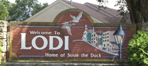 Lodi’s sign says it is home to Susie the Duck – since 1948, a family of ducks has nested in the park right off Main Street every year, so the town sells cracked corn to encourage them to stay, and holds an annual Rubber Duck race in honor of the original Susie. What a nice story!