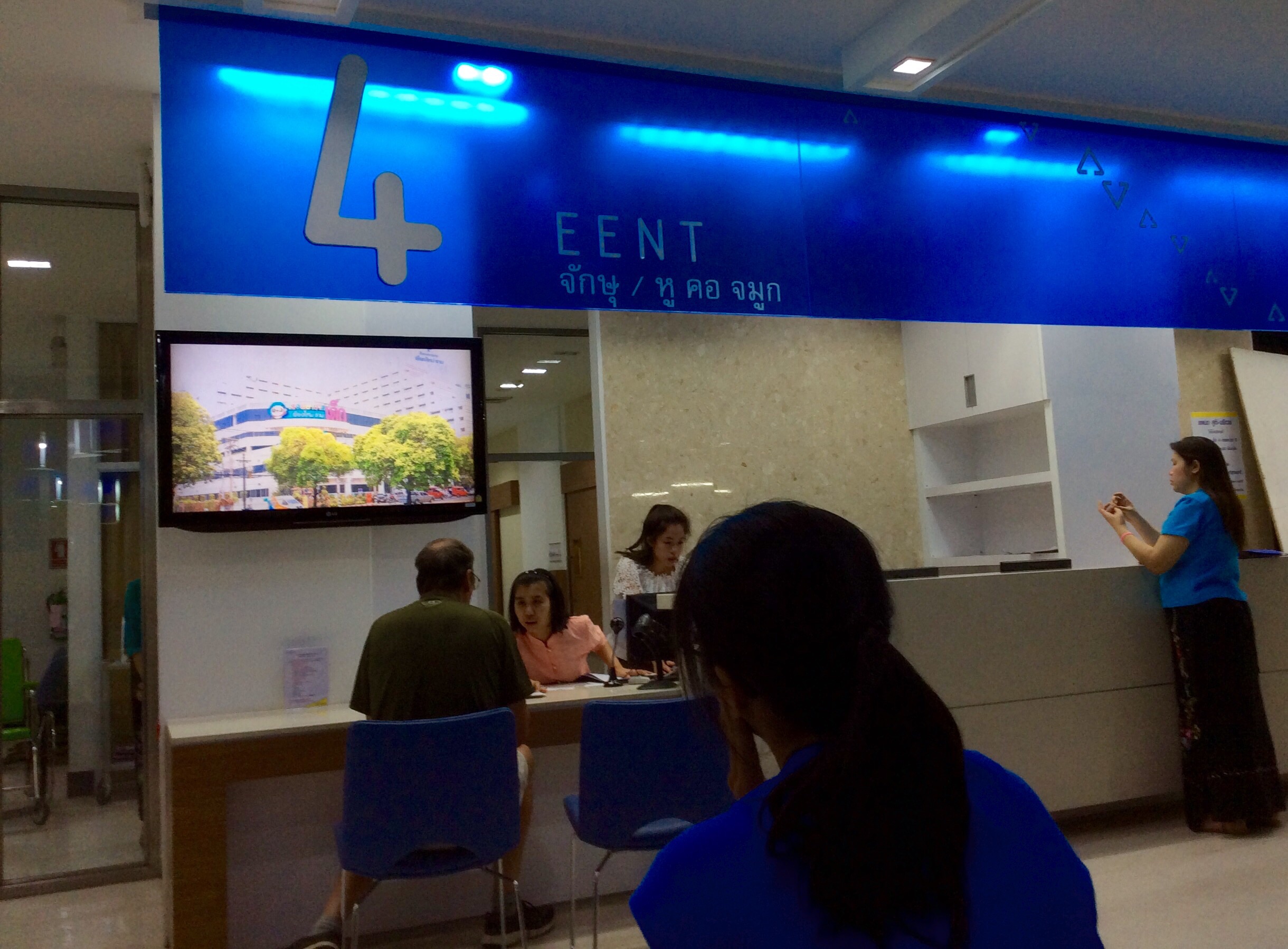 Right inside the entrance were huge signs identifying each specialty area, with smiling staff waiting under each sign. We walked over to the Eye, Ear, Nose and Throat area, and asked if it was possible to get an eye exam today. “All doctors on holiday”, we were told, “come back on the 16th.” Drat!