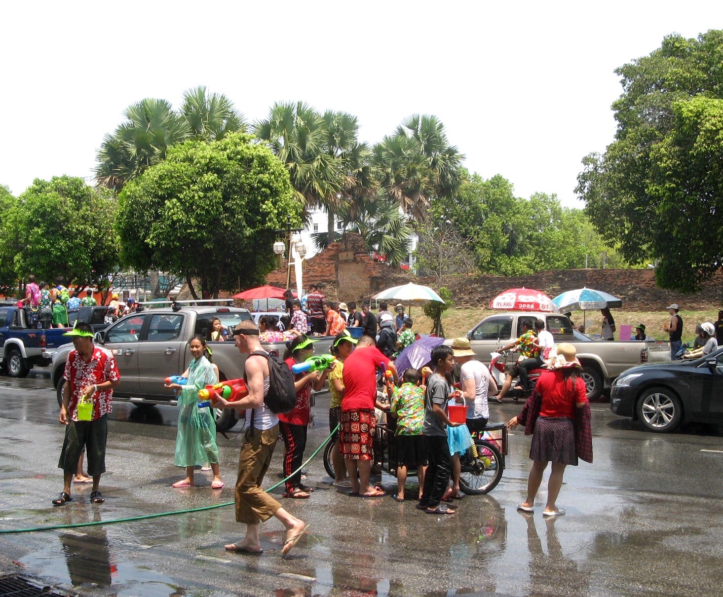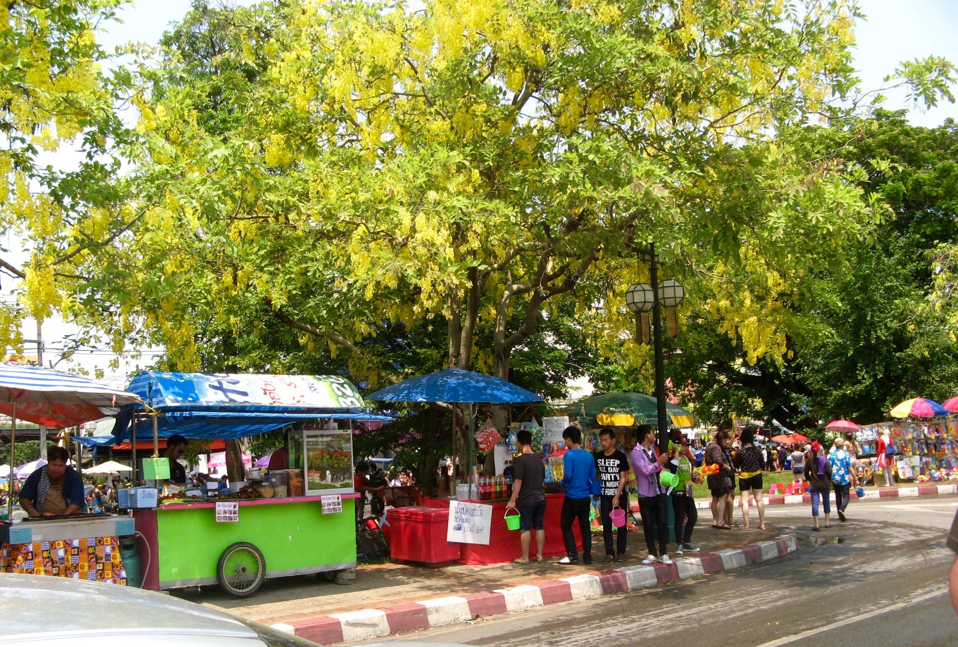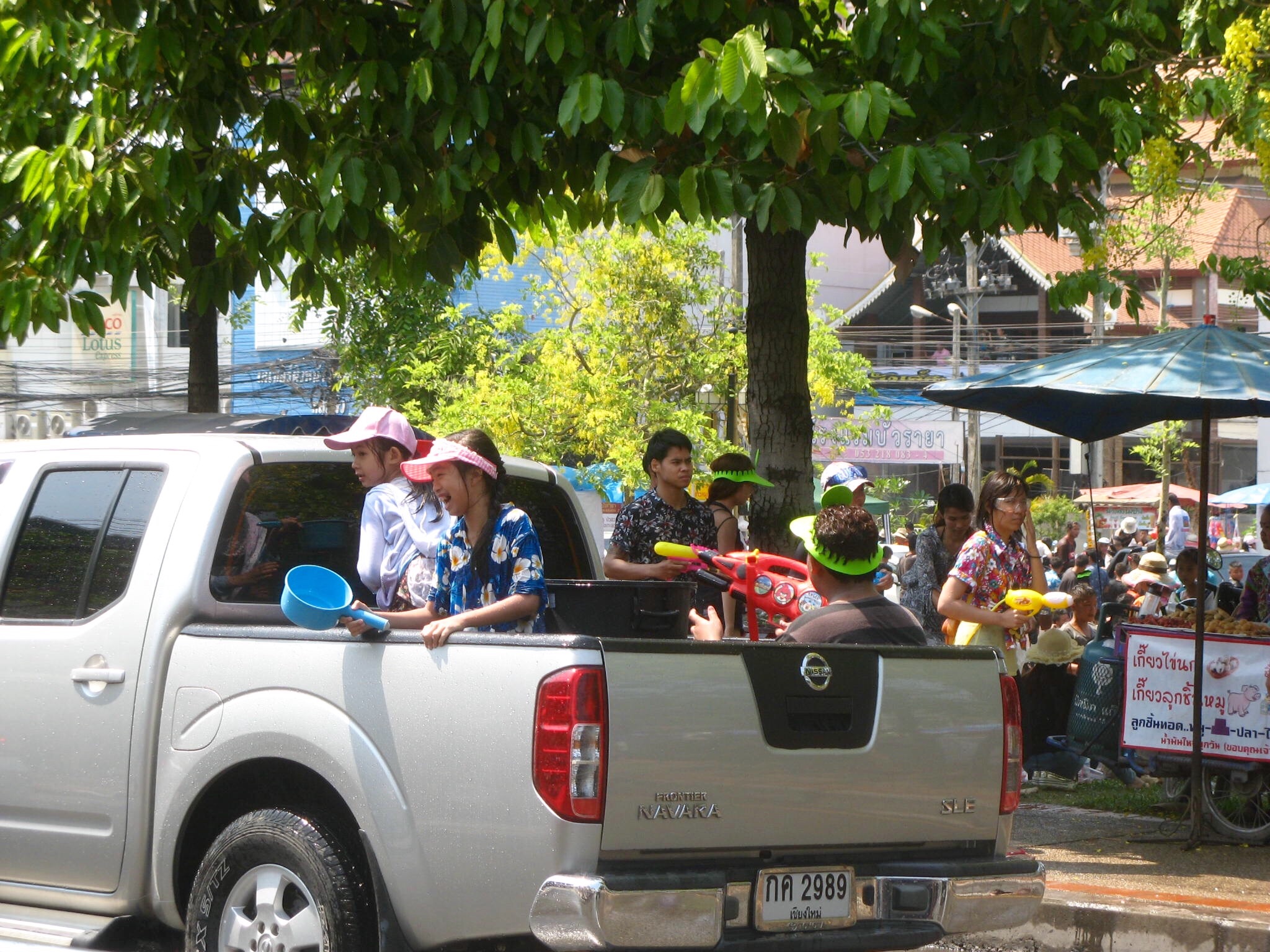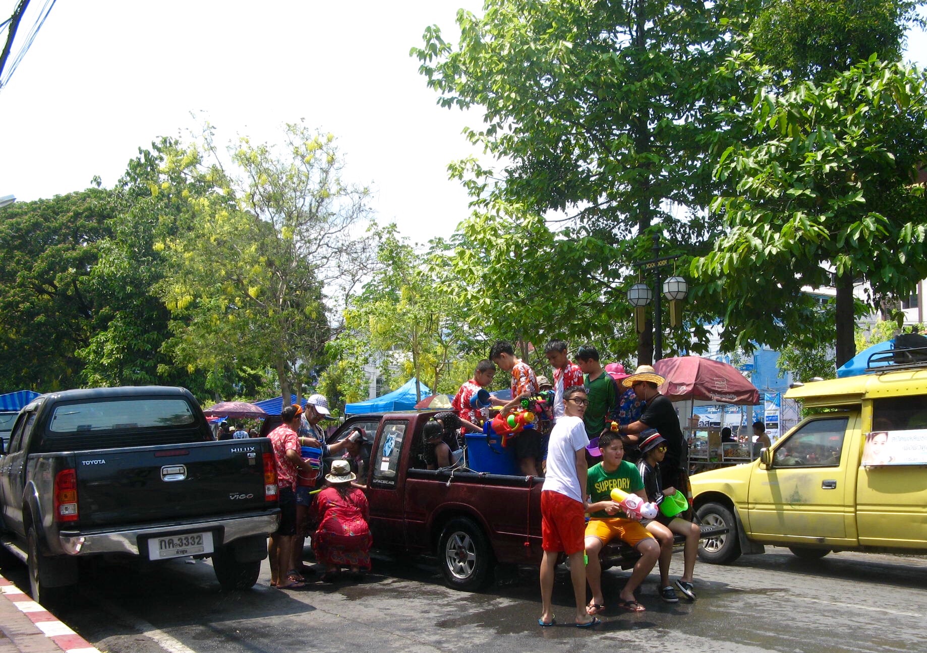 The sun is high in the sky, so no one seems to mind being doused. Everyone is very polite, wishing us happy new year as they dribble water down our backs or squirt our legs. They’re very careful not to splash faces, and they keep away from the street vendors. Trucks roll down the street, truck beds filled with young people throwing water out at passersby.