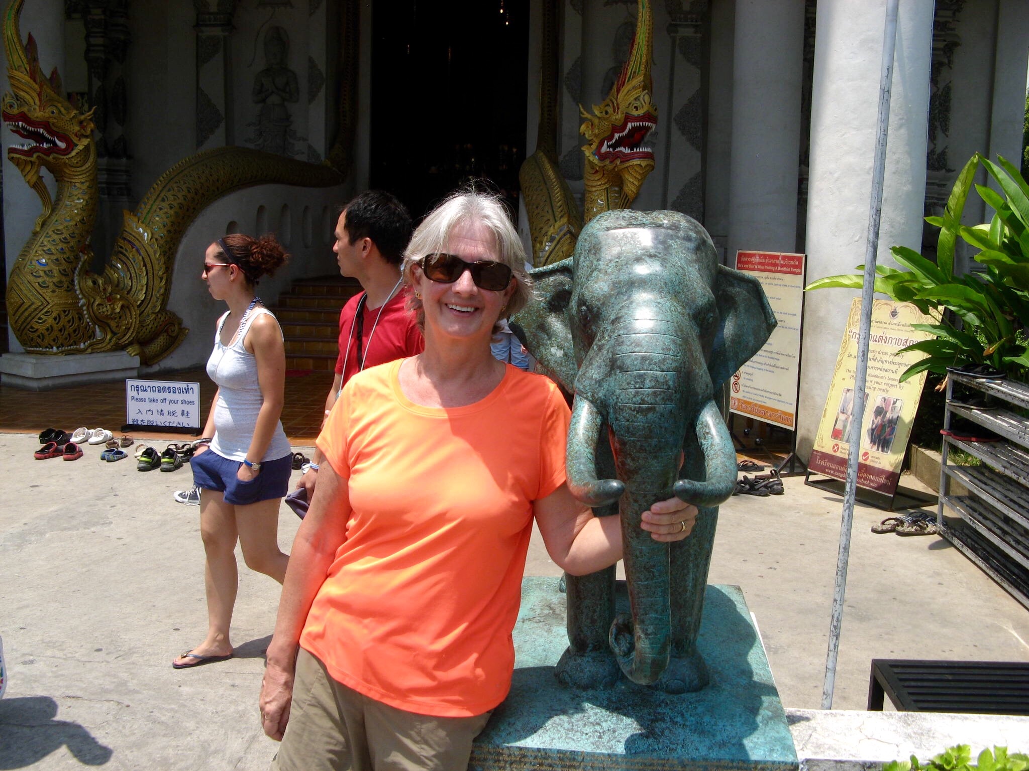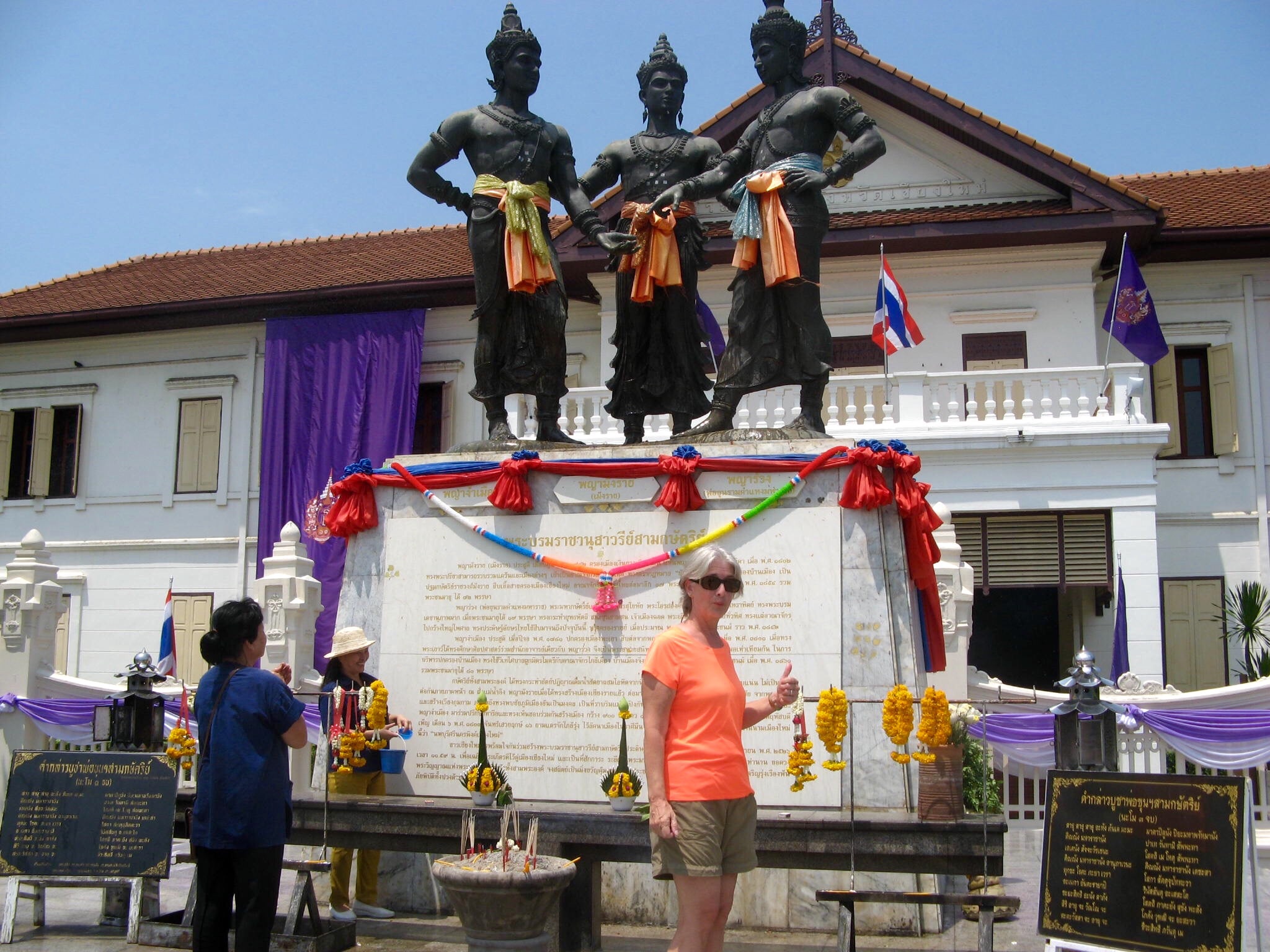 4/14 – Day 2 of Songkran. The partying crowds are making it difficult to walk through the main part of town, so our strategy today is to head down the back streets to see what else Chiang Mai has to offer. The first sight we come upon is the famous monument to the Three Kings who worked together to found Chiang Mai. Aren’t they handsome?