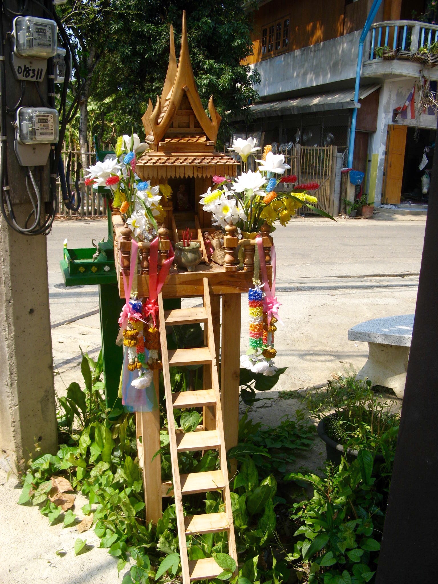 There is also a small spirit house, where fresh offerings are left every day. There is even a ladder, in case the little spirits have trouble climbing up!