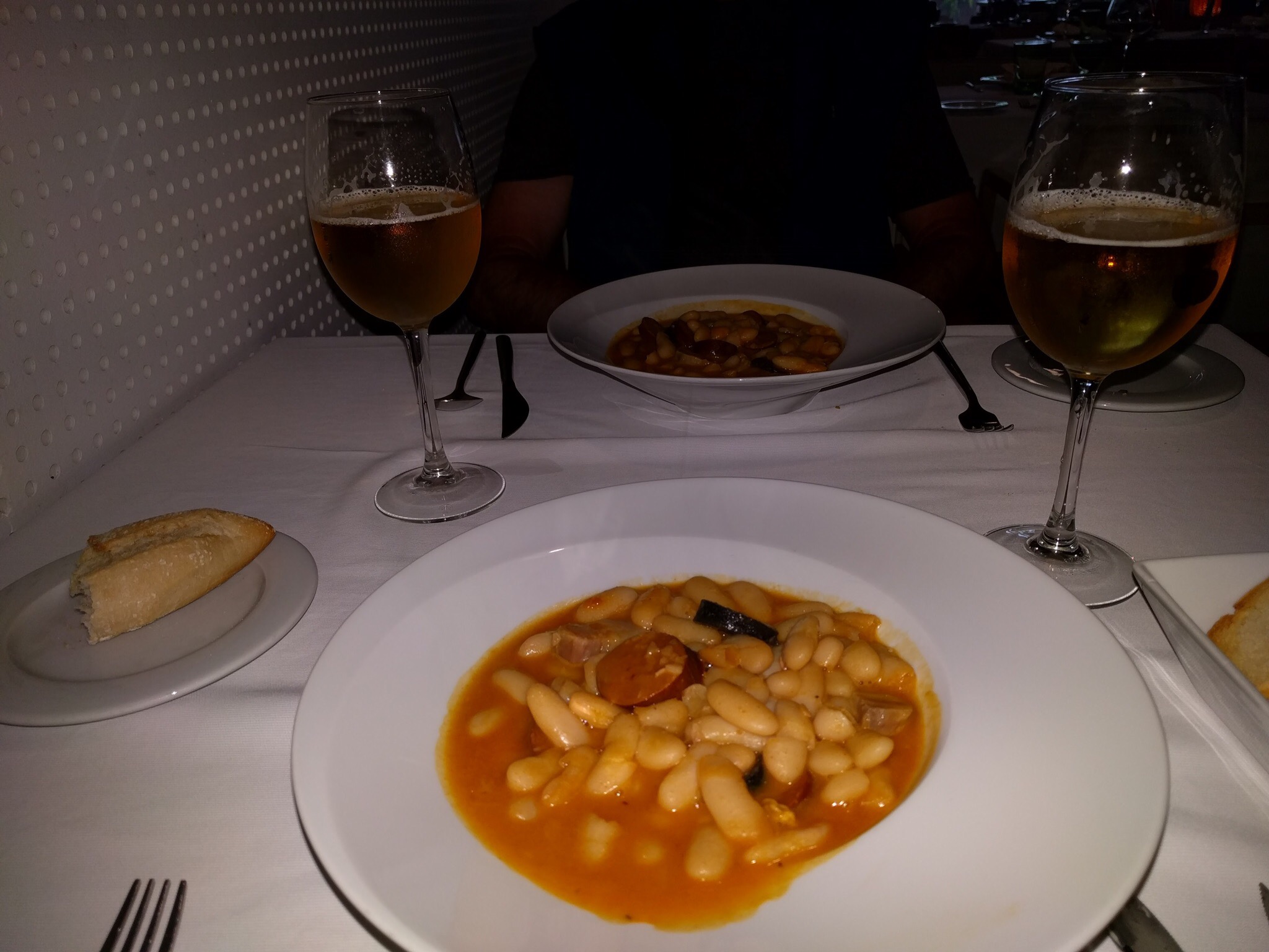 I couldn’t understand one thing on the menu, and Google Translate was not being helpful at all. Evidently the offerings were couched in superlatives that didn’t include words like ‘fish’ or ‘beef’. We asked for an English menu, perhaps? No bananas for you. So Jim manned up and selected a random item on the menu – para dos. The waiter asked lots of questions, but we had to keep shaking our heads in the negative – even with Jim’s pretty decent Spanish, this guy was speaking some other language, and we just didn’t know what he was asking. Bread came, both crunchy and soft, with liver pâté and goat cheese – very nice! Beer came, in tall wine glasses. Little fried cheese empanadas came, courtesy of the chef ( we understood that). Green olives came, then more bread.