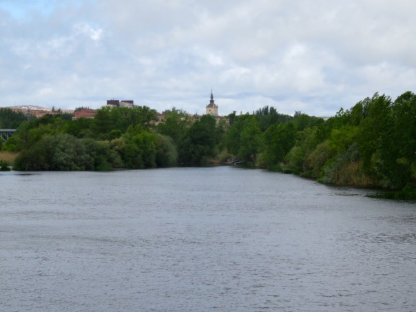 May 12 – Jim has been struggling for a while with a boot that is coming apart. He superglued it as a temporary fix, but he needs new boots. We tried to get him a pair in Cáceres, but the big sporting goods store there only stocked up to size 46, and he is a 48 or 49 depending on the brand (US size 13, wide). There is a big store here in Salamanca called Decathalon. It’s about a 2.5 mile walk from our hostal. It’s not raining too hard, so we set out to find it. We crossed a river.
