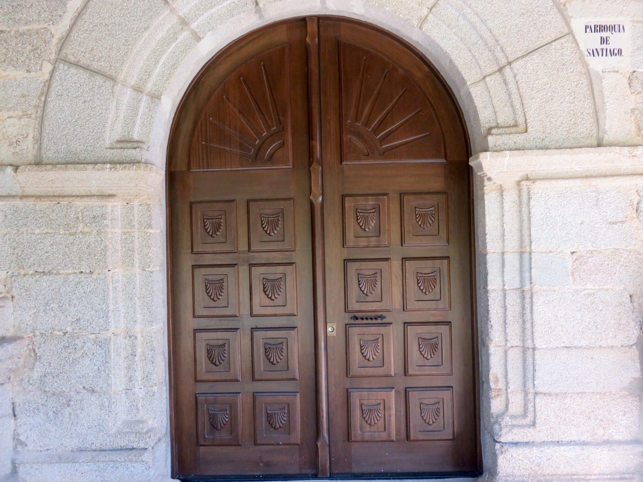 Although the church is locked, there is a small shrine by the side door. As I approach it the light comes on. It is St. James, and a little plate with an image of Our Lady of Fatima.