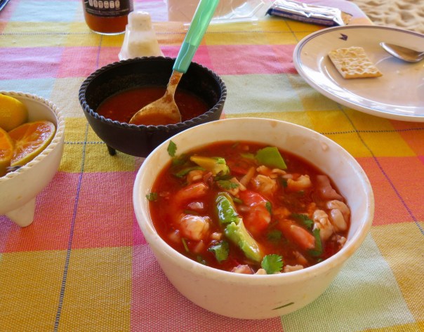 Sometimes we eat at a beachfront restaurant with other tourists. This is a cold seafood and avocado concoction called vuelve a la vida, or “come back to life”. It is just about the most delicious food I have ever eaten.