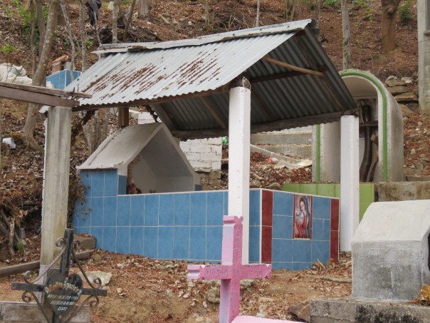 On Sunday evening as we walked to the store, we met a funeral procession coming down the hill to the cemetery. About 50 people, dressed in tee shirts and flip flops or barefoot, some carrying flowers and some singing. A red casket carried on the shoulders of four men. We stood quietly until the procession passed. Later we walked into the cemetery, but couldn’t find where they had placed the new addition.