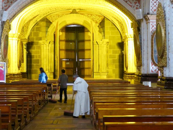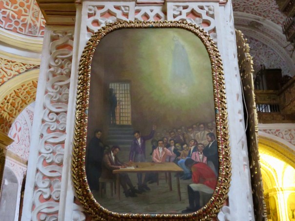 It had scenes painted on glass around the doorway that depicted the coming of the Spaniards and conversion of the native Ecuadorians.