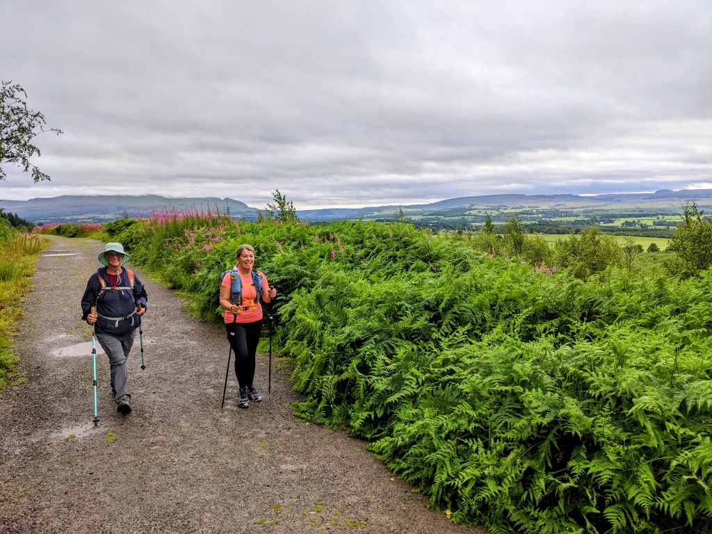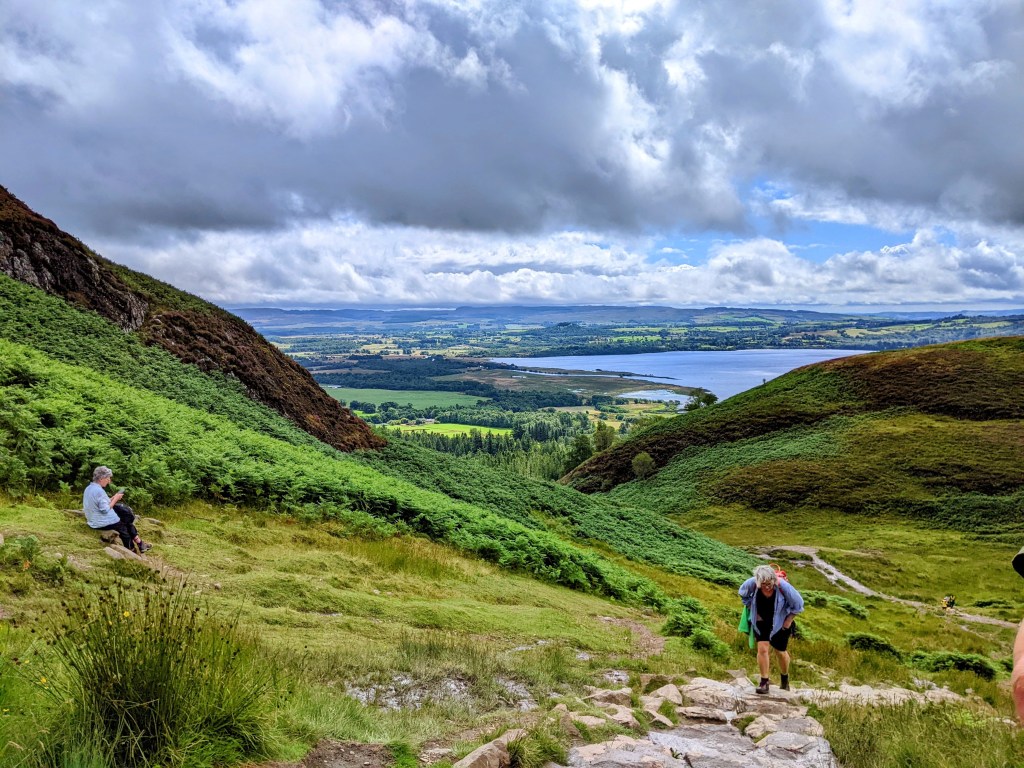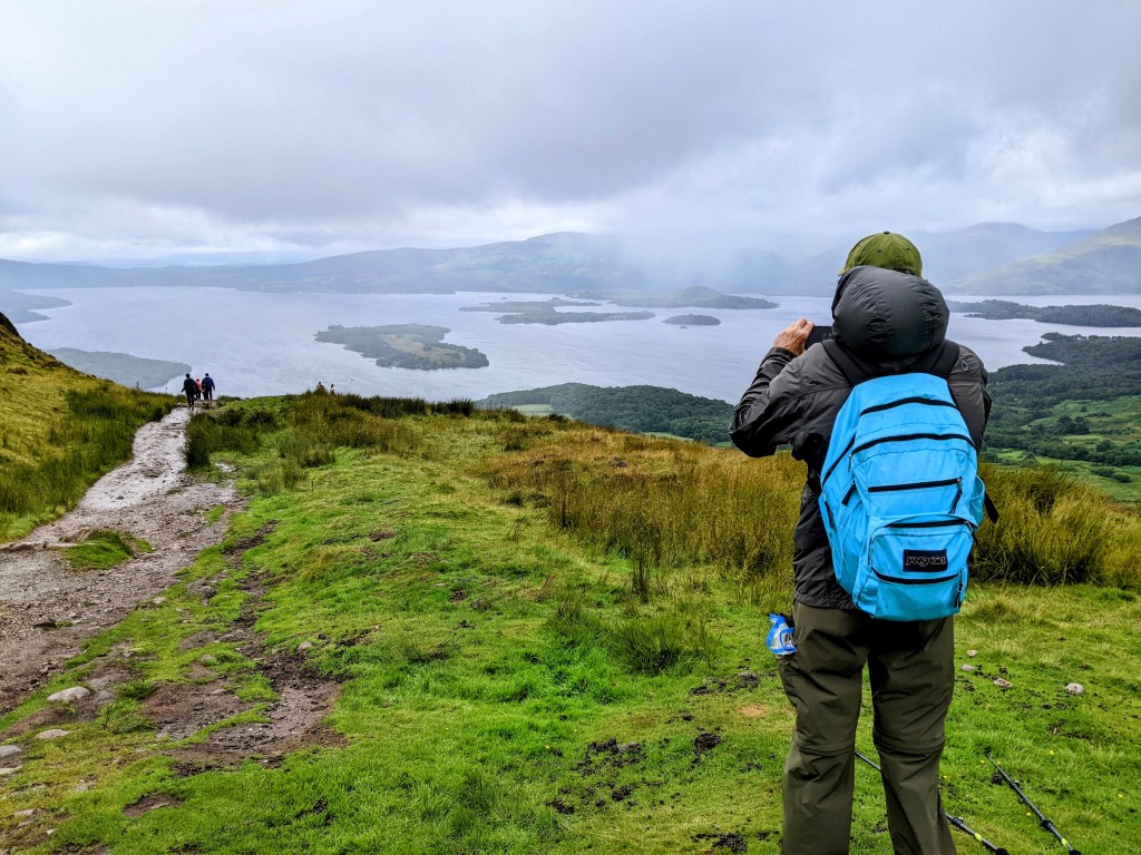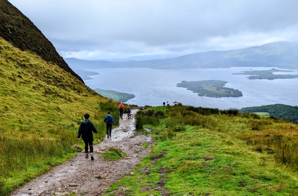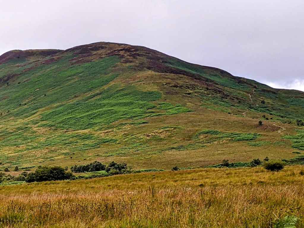 After yesterday’s long but fairly flat walk, today’s route will be more challenging, requiring a steep climb to get over Conic Hill. The weather is overcast and gray, but the promised rain isn’t falling yet. Off we go.
