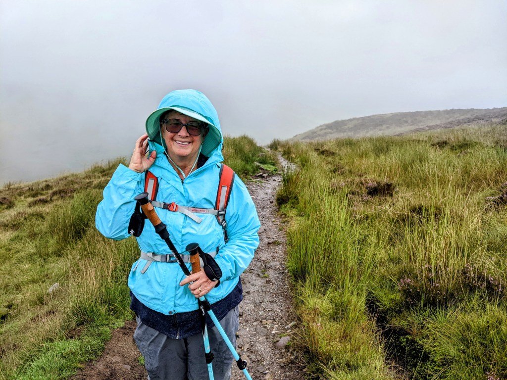As we climbed, the rain started, and the trail was busy with hikers ascending the narrow path. The trail became a stream, with water cascading down as we went up. I was going really slowly, and looking for a place to rest, but there was none. No pix of the uphill slog – you’ll have to use your imagination! Finally, we got to the top.