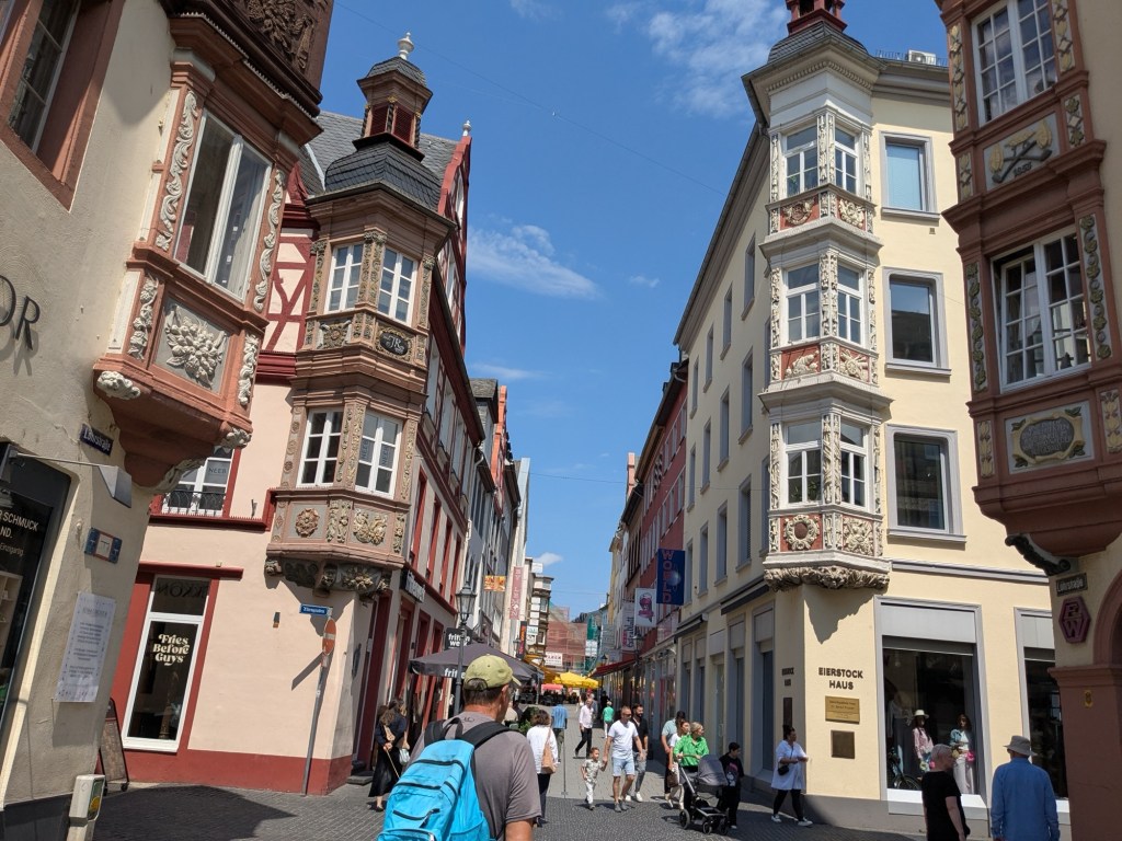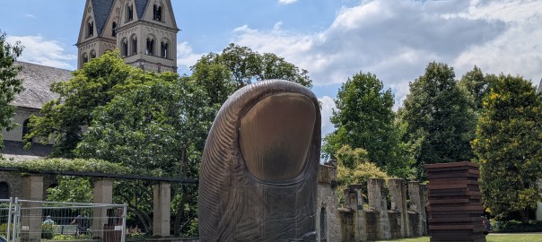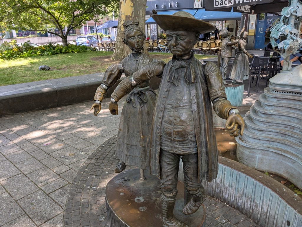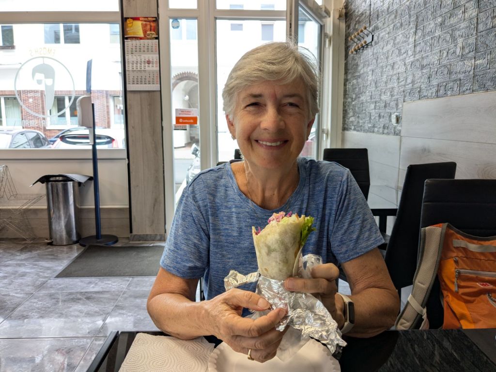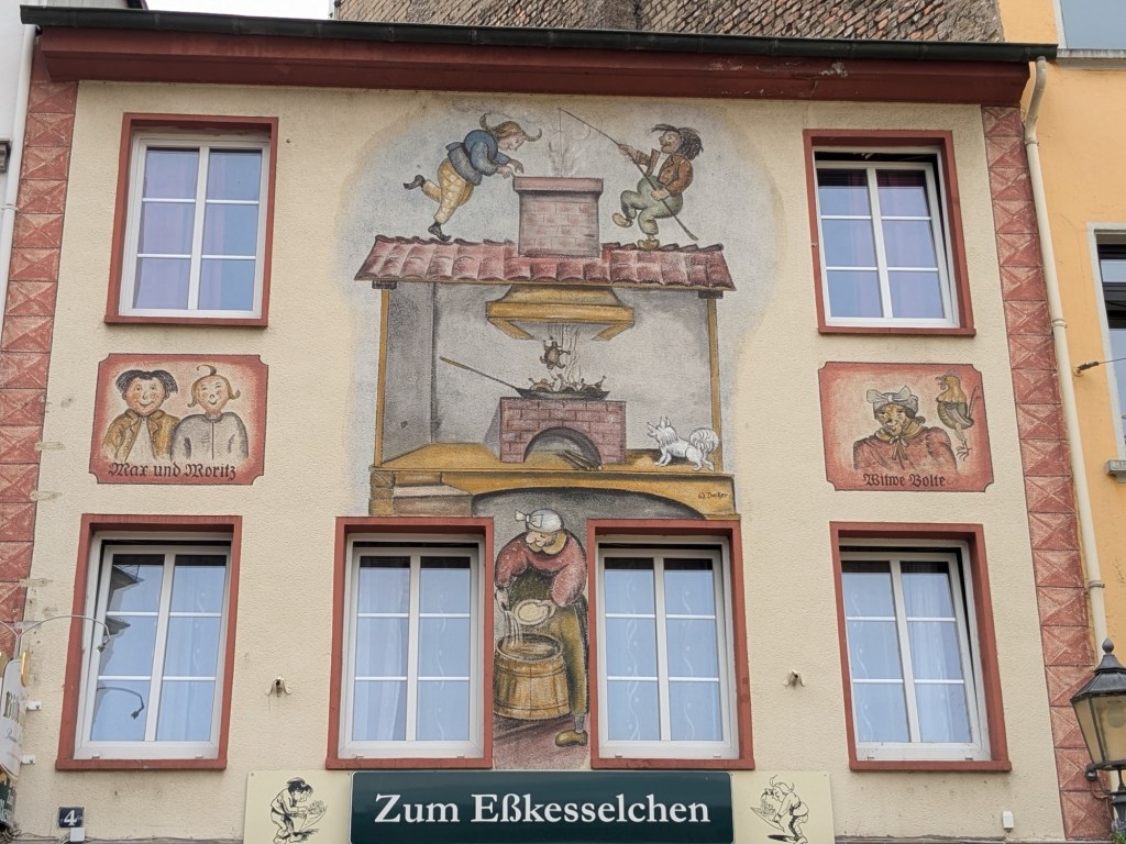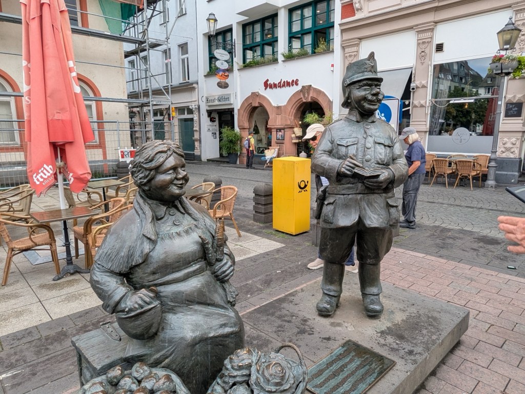 Quaint architecture, old fashioned but not oldCute little statues with moveable armsA pedestrian shopping street They have a Woolworth here!We looked into the Church of Our Lady, which has been an active parish since the 600s. Parts of this building dates from 1180, with renovations after WWII.The altarpiece New stained glassA bit of wall art the sign says “to the little kettle”These statues had little plaques posted next to them, but we didn’t get the jokes…Pretty flourishesWe walked toward the river A statue of Kaiser Wilhelm on his horse, accompanied by an angelThis is the Eck (corner) – where the Moselle River on the right flows into the RhineRhine River cruises on one sideA not very old (rebuilt) castle on the other sideThere is a monument celebrating all the different regions that make up GermanyWe popped into the modern art museum. There was one Picasso….… but otherwise, we were not impressed I had been craving a good doner for a while, and this was the town to get one. With the addition of a little red cabbage for a uniquely German twist, it was delicious!Thanks Koblenz – we had a great time!