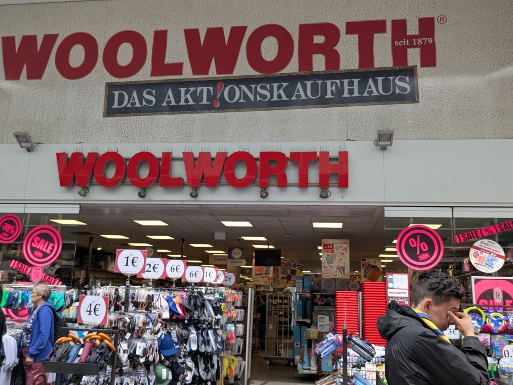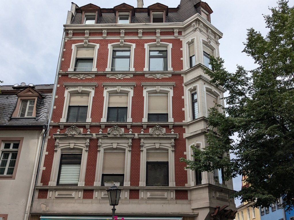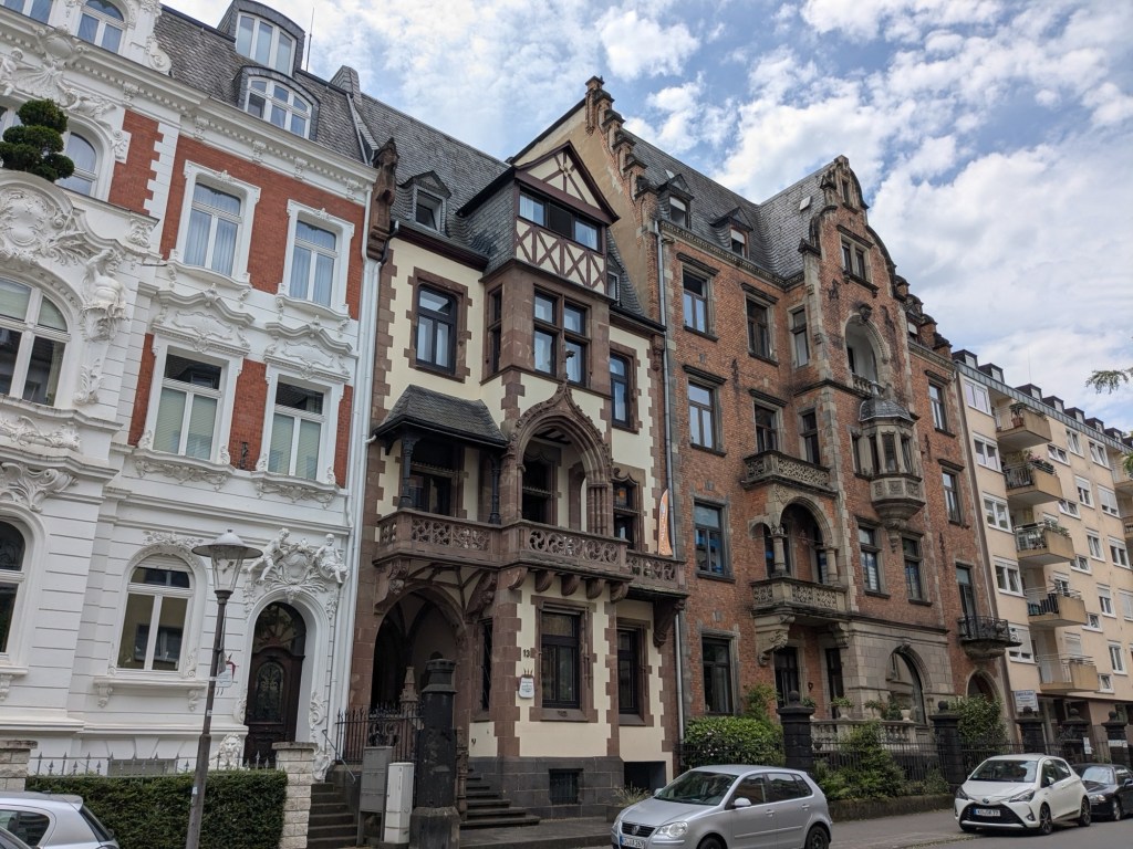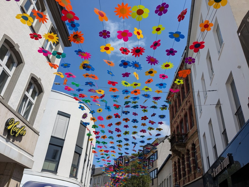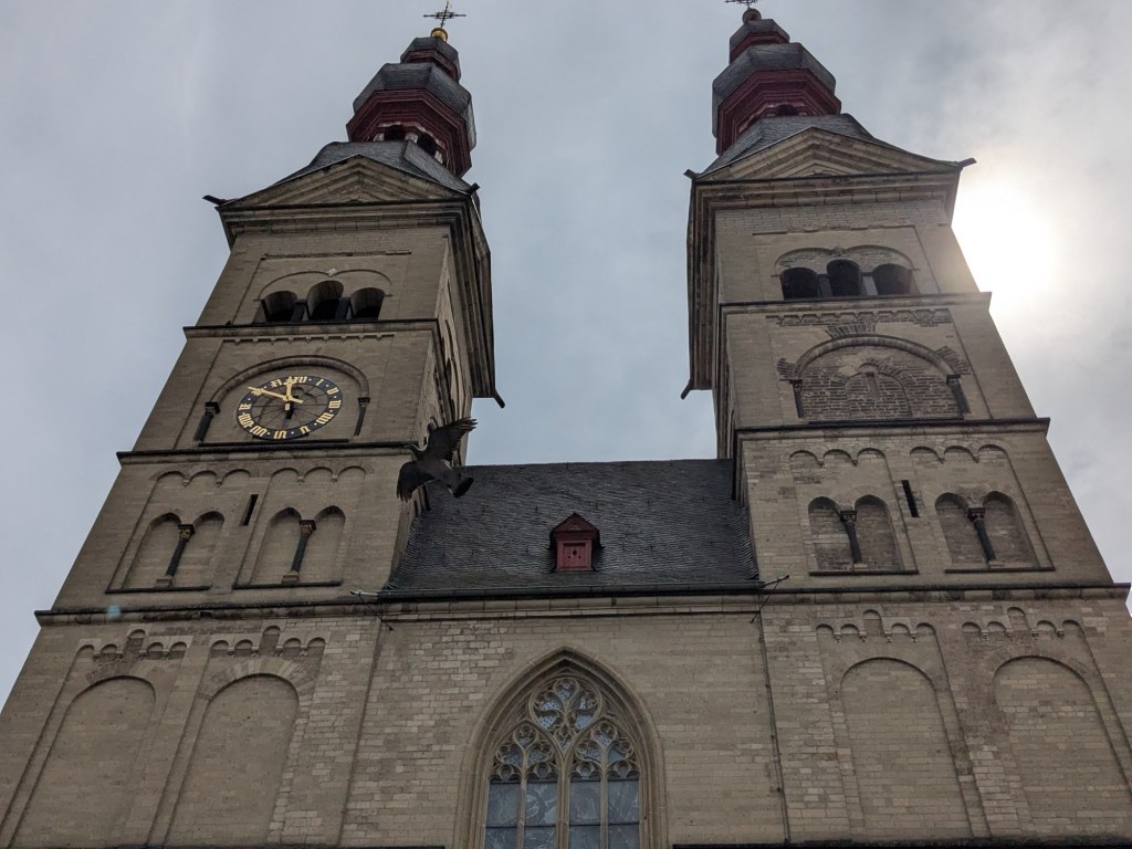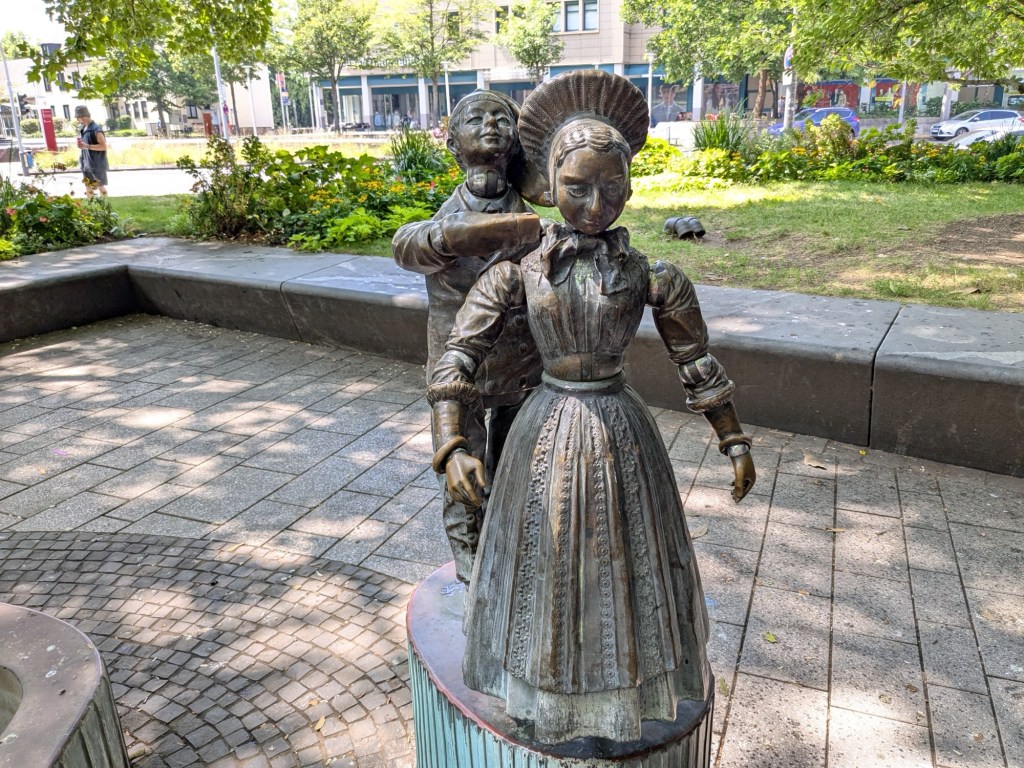 Quaint architecture, old fashioned but not oldCute little statues with moveable armsA pedestrian shopping street They have a Woolworth here!We looked into the Church of Our Lady, which has been an active parish since the 600s. Parts of this building dates from 1180, with renovations after WWII.The altarpiece New stained glassA bit of wall art the sign says “to the little kettle”These statues had little plaques posted next to them, but we didn’t get the jokes…Pretty flourishesWe walked toward the river A statue of Kaiser Wilhelm on his horse, accompanied by an angelThis is the Eck (corner) – where the Moselle River on the right flows into the RhineRhine River cruises on one sideA not very old (rebuilt) castle on the other sideThere is a monument celebrating all the different regions that make up GermanyWe popped into the modern art museum. There was one Picasso….… but otherwise, we were not impressed I had been craving a good doner for a while, and this was the town to get one. With the addition of a little red cabbage for a uniquely German twist, it was delicious!Thanks Koblenz – we had a great time!