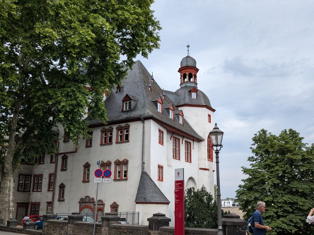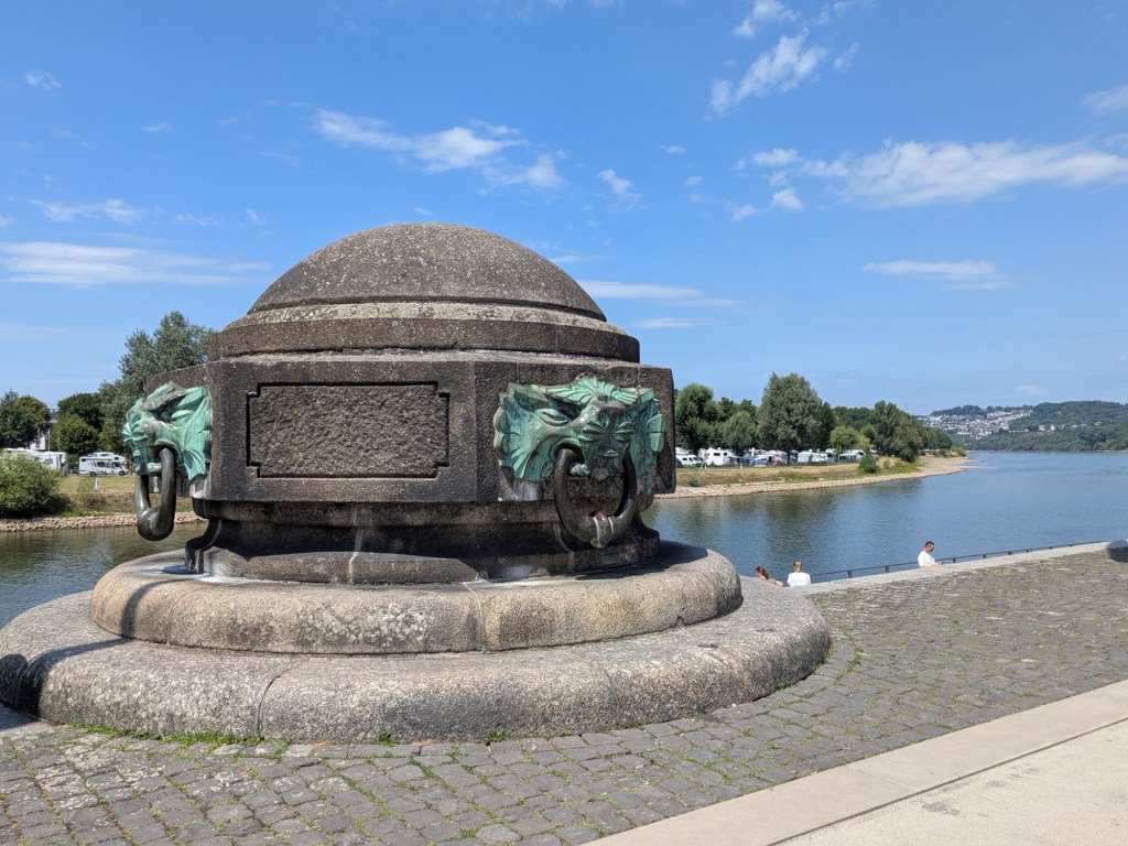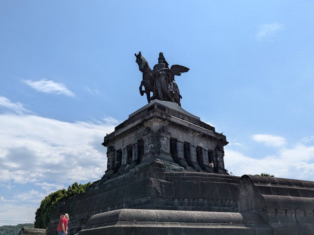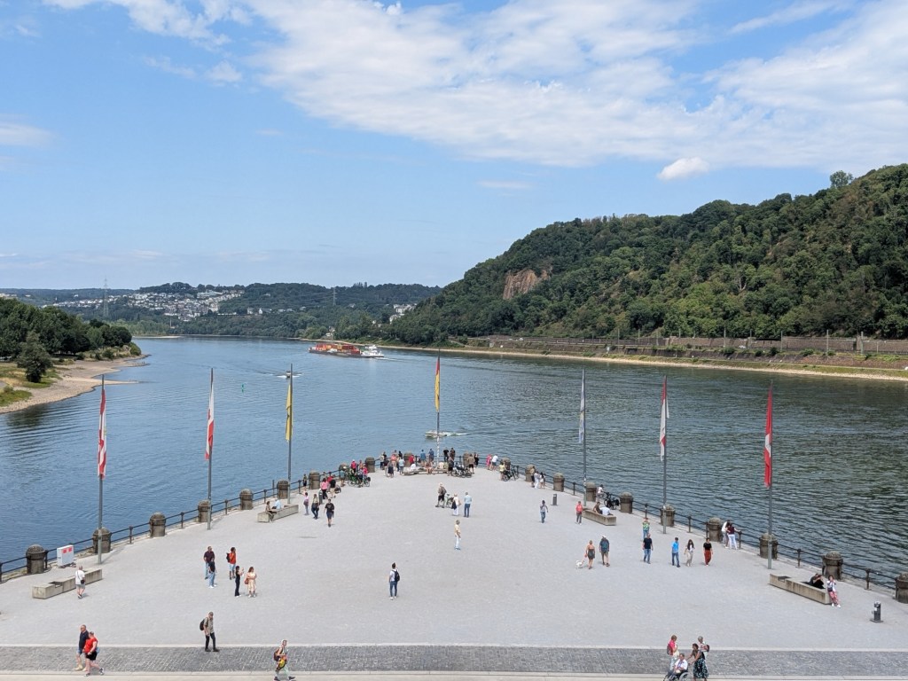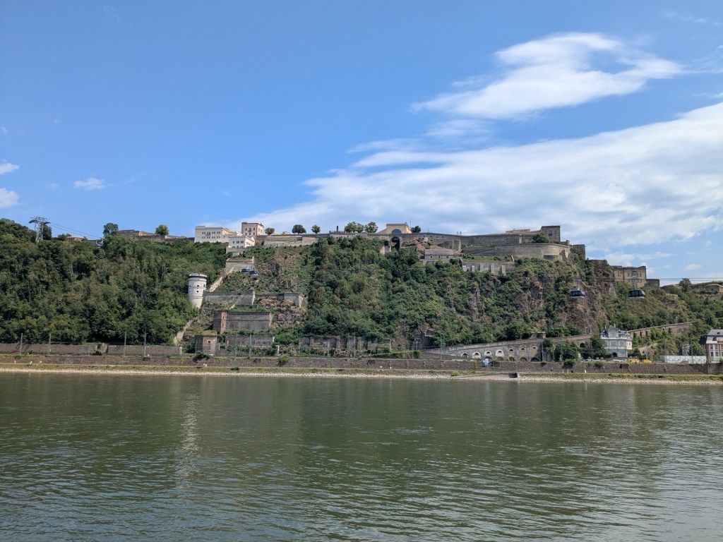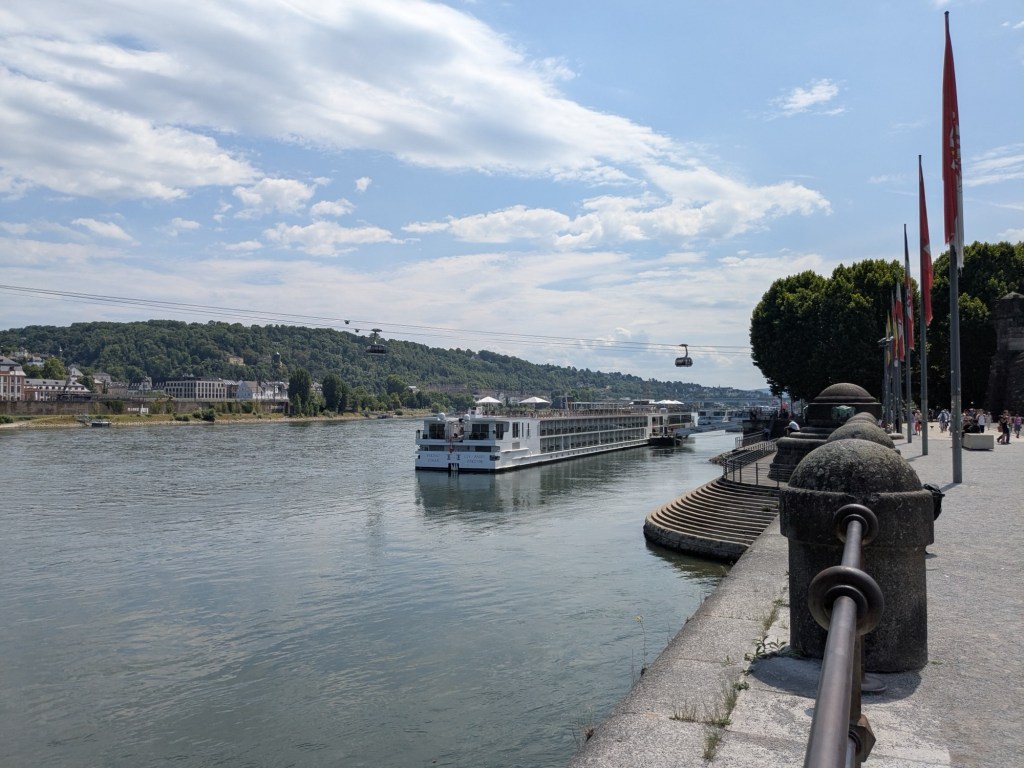 July 13 – Back on the train for the two hour ride south to Koblenz. This is a much smaller city, that sits at the Deutches Eck, where the Moselle River meets the Rhine.