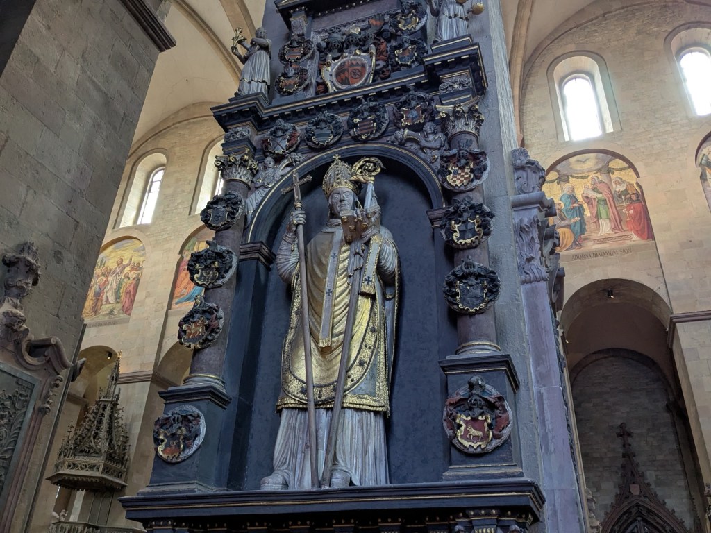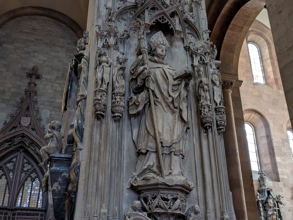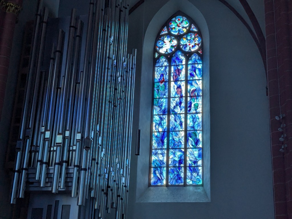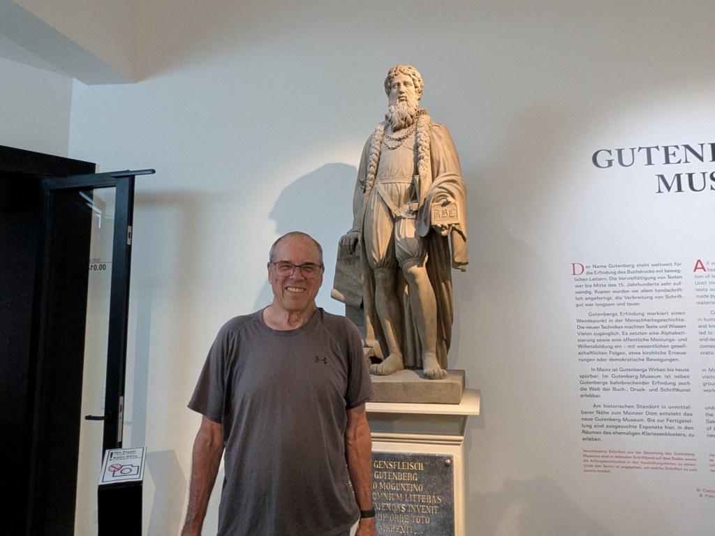 Our hotel is right on a path that follows the river……with a shady corridor for strolling and sittingMainz is a city of many faces…many of them quite somberWe walked down to see St. Martin’s Cathedral, or the Mainzer Dom. Although Mainz was pretty thoroughly bombed in 1945, the cathedral didn’t suffer much damage.The inside was dark……and filled with bishops looking down at us disapprovingly …one on every columnI usually don’t show pictures of crucifixions, but this one spoke to meA pretty altarpiece, but absolutely no one is smiling…and a guy who’s lost his head!We walked around the old city and admired the architecture We checked out the Gutenberg Museum – Johannes Gutenberg was born and died in Mainz in the 1400sThere were several artists rendering of what he may have looked like, but he never sat for a portrait, so no one knows for sureHis invention of moveable type transformed communication and the worldWe saw two of Gutenberg’s bibles – only twenty-one originals remain intact worldwide. Only black ink was used for printing. The colorful capital letters and red highlights were added later by hand.We watched a demonstration of the moveable type process given totally in German. We got the general idea.Happy JimThe museum shared space with the Natural History Museum – a small but interesting collection of old stuffThis is the famous Fastnachtsbrunnen, or Carnival Sculpture …containing hundreds of characters from Mainz’s winter carnivalWe checked out lots more faces around town…then made or way down to St. Stephen’s. Another church? Are you kidding? Wait for it…St. Stephen’s was bombed during WWII, and lost all its windows. Nine new stained glass windows were designed by artist Marc Chagall, a Russian Jew, all in shades of blue. The windows contain scenes from the Old Testament, and were offered to show the commonality between Judaism and Christianity.In a close-up view you can see people…and flowers…and dovesThe church is bathed in serene blue light. Just lovely.And so our journey ended. We brought home a generic blue delft Dutch plate to remind us of our hike on the Pieterpad (although we didn’t see many windmills), as we couldn’t find any Pieterpad related souvenirs……and a plate to remind us of the places we stopped along the Rhine River. We’re tired, and happy to be home.