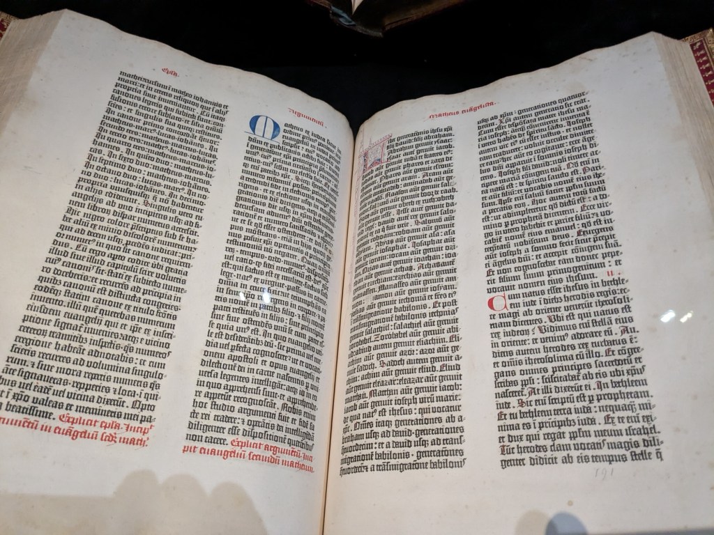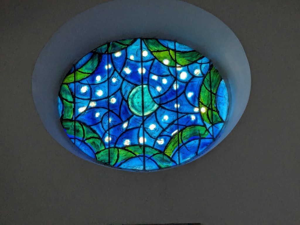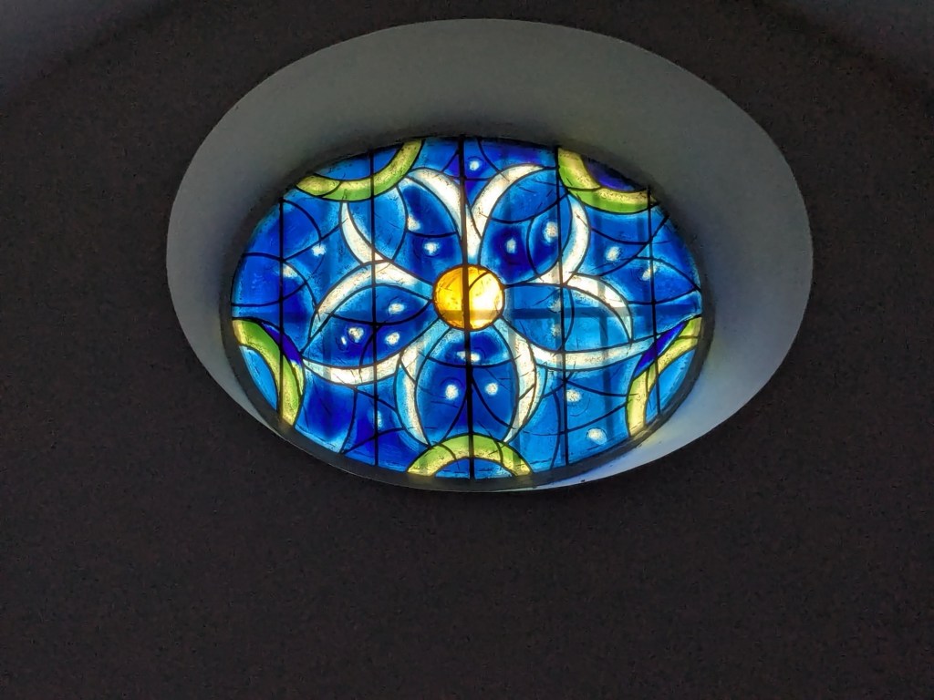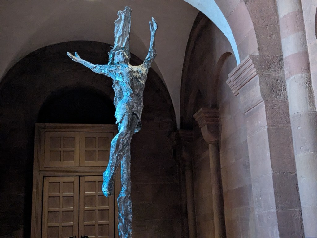 Our hotel is right on a path that follows the river……with a shady corridor for strolling and sittingMainz is a city of many faces…many of them quite somberWe walked down to see St. Martin’s Cathedral, or the Mainzer Dom. Although Mainz was pretty thoroughly bombed in 1945, the cathedral didn’t suffer much damage.The inside was dark……and filled with bishops looking down at us disapprovingly …one on every columnI usually don’t show pictures of crucifixions, but this one spoke to meA pretty altarpiece, but absolutely no one is smiling…and a guy who’s lost his head!We walked around the old city and admired the architecture We checked out the Gutenberg Museum – Johannes Gutenberg was born and died in Mainz in the 1400sThere were several artists rendering of what he may have looked like, but he never sat for a portrait, so no one knows for sureHis invention of moveable type transformed communication and the worldWe saw two of Gutenberg’s bibles – only twenty-one originals remain intact worldwide. Only black ink was used for printing. The colorful capital letters and red highlights were added later by hand.We watched a demonstration of the moveable type process given totally in German. We got the general idea.Happy JimThe museum shared space with the Natural History Museum – a small but interesting collection of old stuffThis is the famous Fastnachtsbrunnen, or Carnival Sculpture …containing hundreds of characters from Mainz’s winter carnivalWe checked out lots more faces around town…then made or way down to St. Stephen’s. Another church? Are you kidding? Wait for it…St. Stephen’s was bombed during WWII, and lost all its windows. Nine new stained glass windows were designed by artist Marc Chagall, a Russian Jew, all in shades of blue. The windows contain scenes from the Old Testament, and were offered to show the commonality between Judaism and Christianity.In a close-up view you can see people…and flowers…and dovesThe church is bathed in serene blue light. Just lovely.And so our journey ended. We brought home a generic blue delft Dutch plate to remind us of our hike on the Pieterpad (although we didn’t see many windmills), as we couldn’t find any Pieterpad related souvenirs……and a plate to remind us of the places we stopped along the Rhine River. We’re tired, and happy to be home.