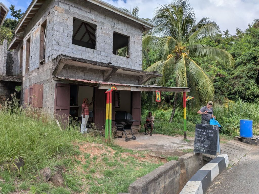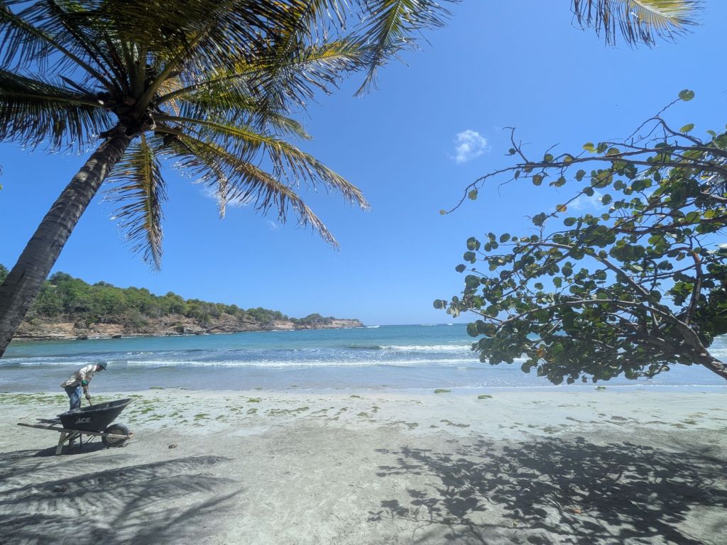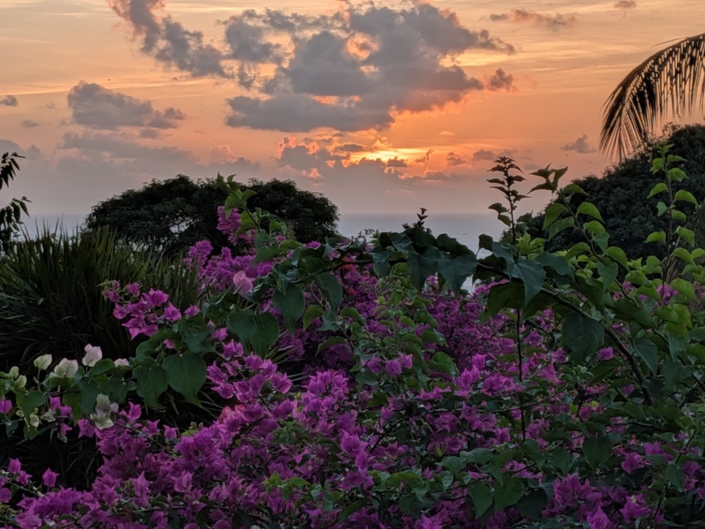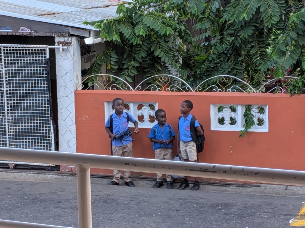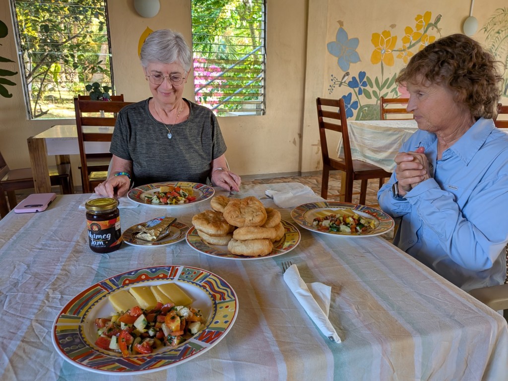 Jim got up early to capture the sunrise from our veranda Breakfast of vegetables, cheese and fry bread with nutmeg jam, enjoyed with our new friend Angela from Canada.Fresh tropical fruit every morning, most plucked from Ingrid’s garden – star fruit today!So many flowers!The road to the beach – no signs, no traffic A farm along the roadside growing cabbages in the shade of pepper plantsWe have the lovely white sand beach all to ourselves The man with the wheelbarrow rakes the seaweed off the beach every morning A person could get used to this We walked by this place, figuring it was an abandoned building. Inside was a little old lady who served us… …the best chicken curry ever!Girls walking home from schoolBoys waiting for a bus – they must live farther awayOur evening swim – the pool has a deep lap area that Jim really likes.Around sunset, a big wind blows through, roaring like a locomotive and bringing five minutes of rain. Then it is over and the calm returns. Ah, the tropics!