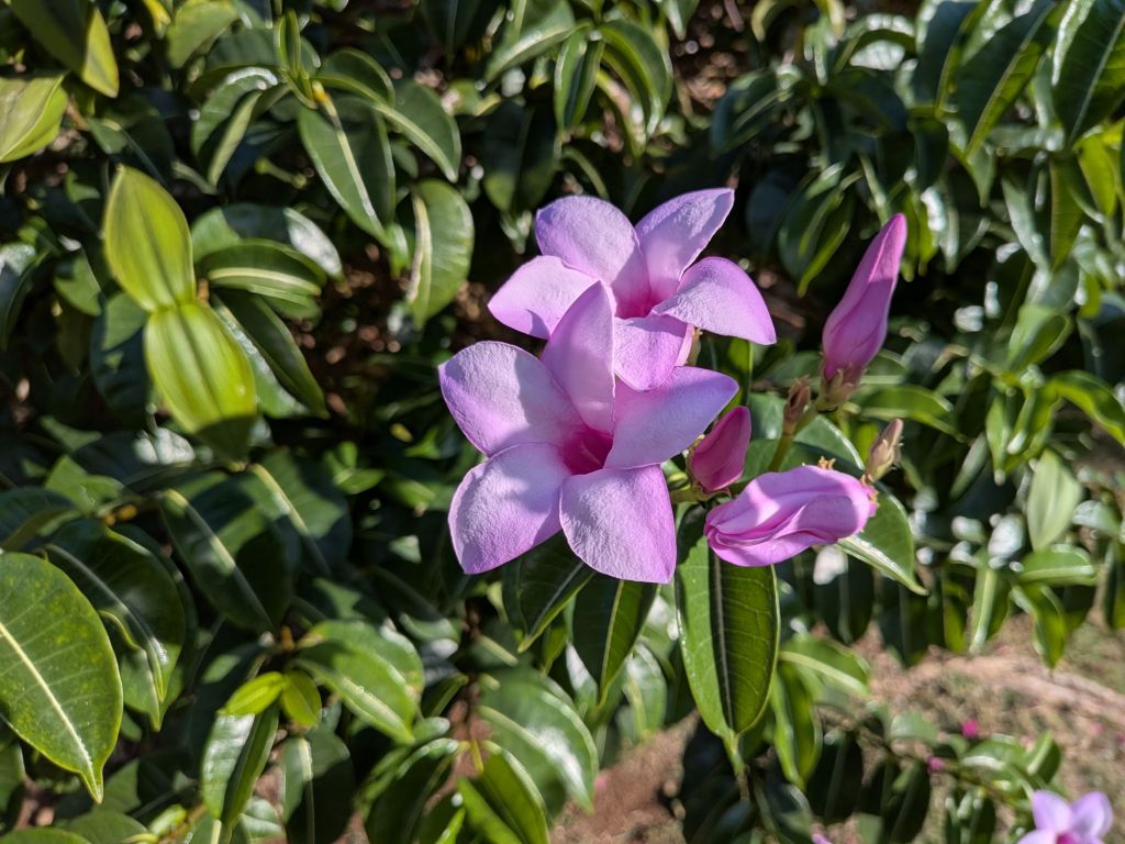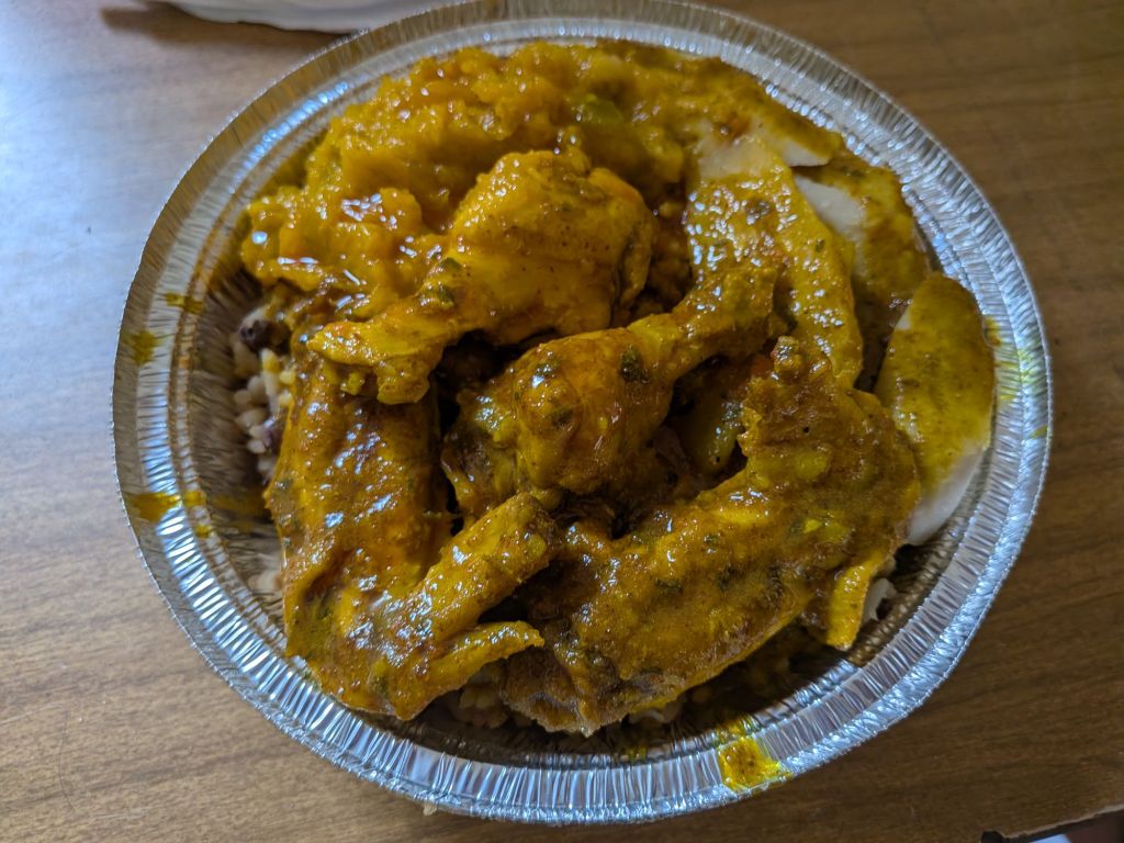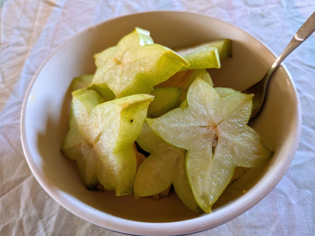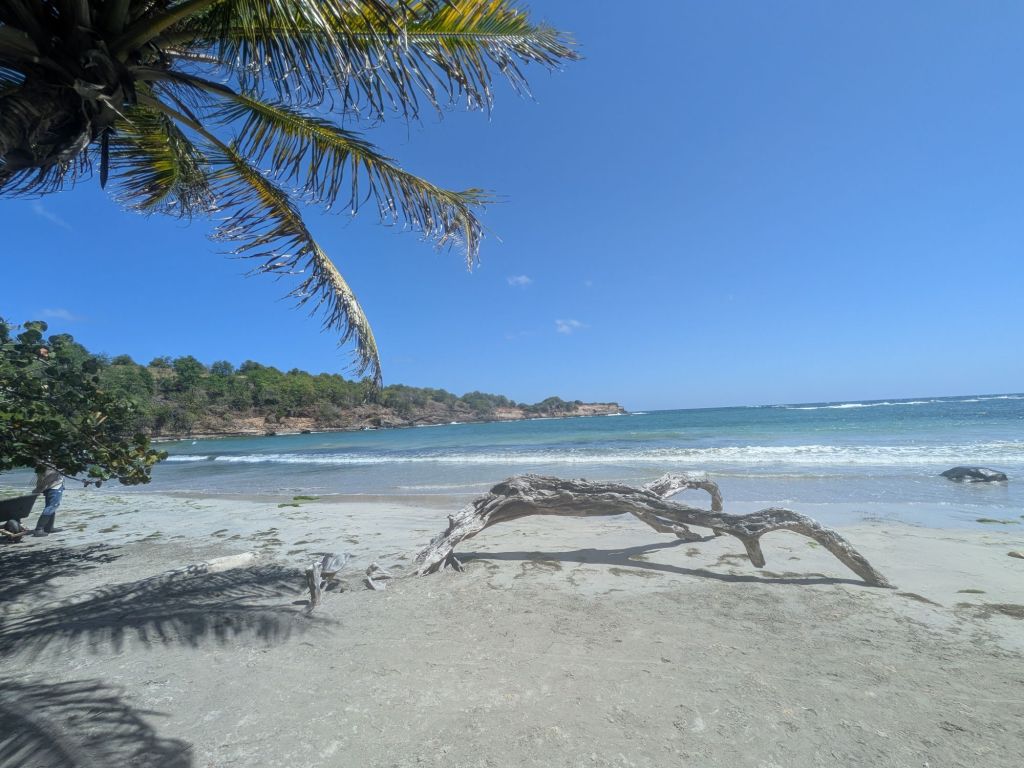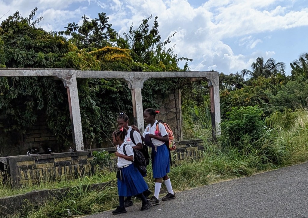 Jim got up early to capture the sunrise from our veranda Breakfast of vegetables, cheese and fry bread with nutmeg jam, enjoyed with our new friend Angela from Canada.Fresh tropical fruit every morning, most plucked from Ingrid’s garden – star fruit today!So many flowers!The road to the beach – no signs, no traffic A farm along the roadside growing cabbages in the shade of pepper plantsWe have the lovely white sand beach all to ourselves The man with the wheelbarrow rakes the seaweed off the beach every morning A person could get used to this We walked by this place, figuring it was an abandoned building. Inside was a little old lady who served us… …the best chicken curry ever!Girls walking home from schoolBoys waiting for a bus – they must live farther awayOur evening swim – the pool has a deep lap area that Jim really likes.Around sunset, a big wind blows through, roaring like a locomotive and bringing five minutes of rain. Then it is over and the calm returns. Ah, the tropics!