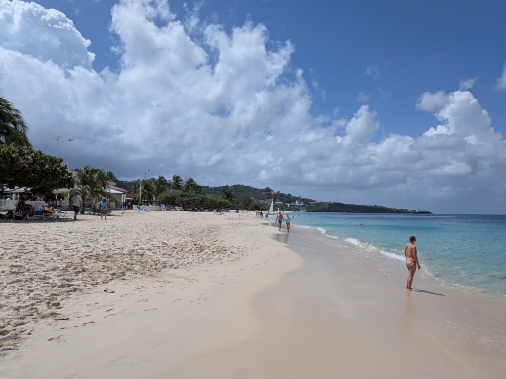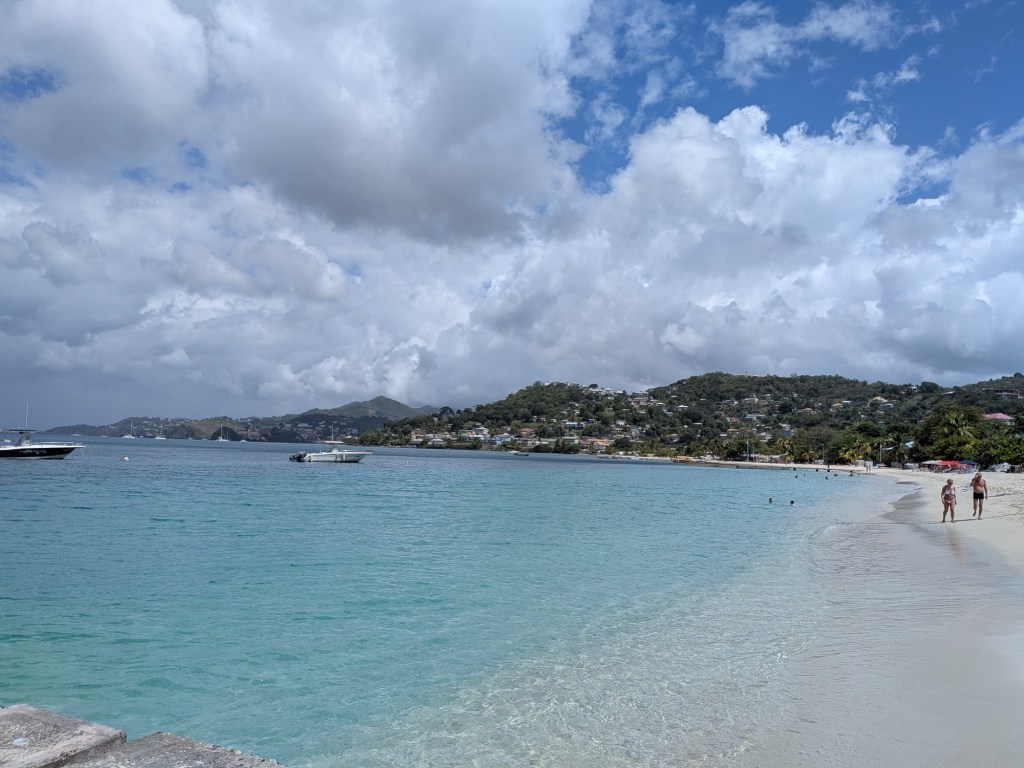 Feb 16 – A 45 minute ride down from the hills in a packed van, followed by a 20 minute ride in a local van, got us to our next abode. The Bouganvillea apartments in bustling St. George’s, are just a block from beautiful Grand Anse Beach.