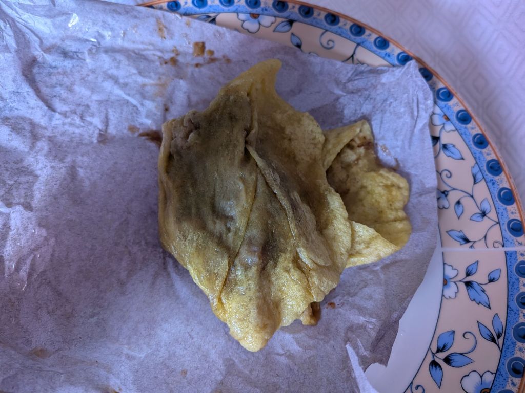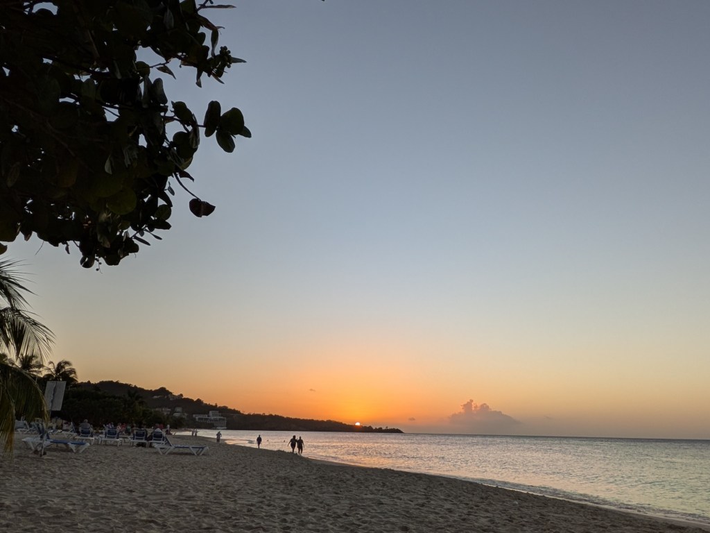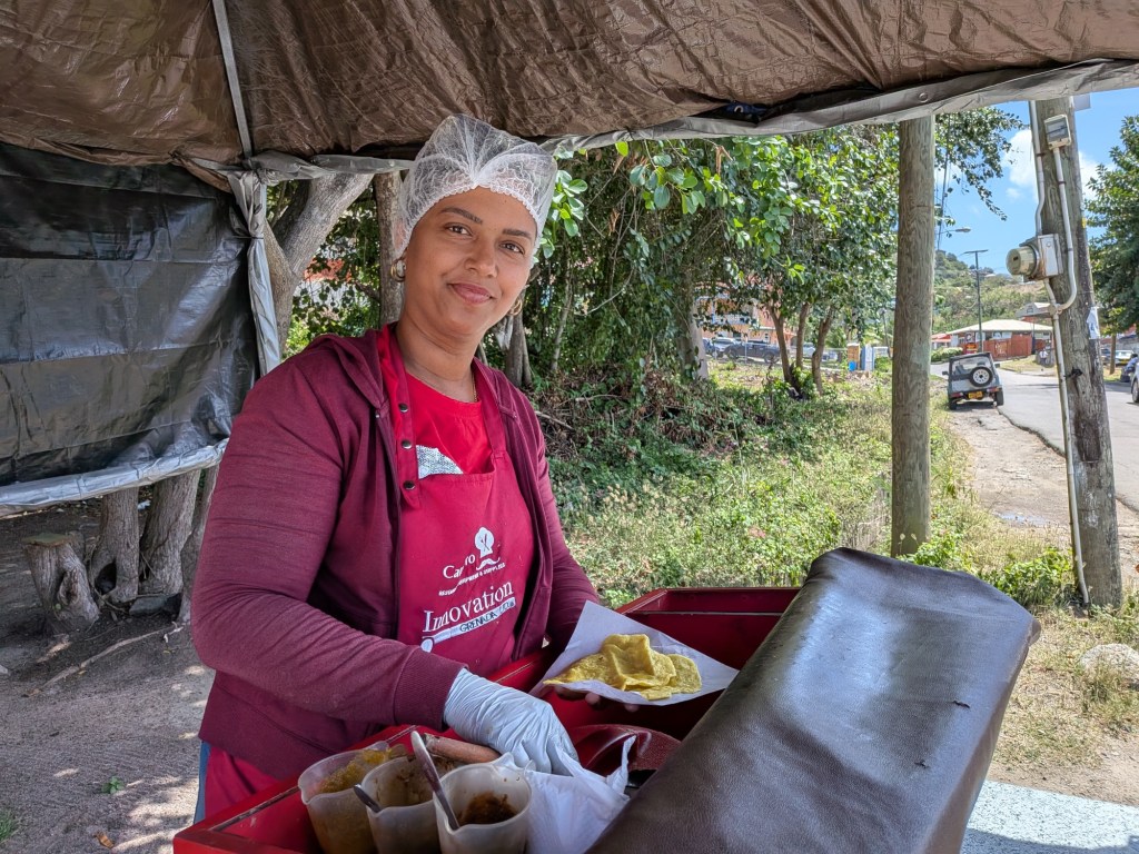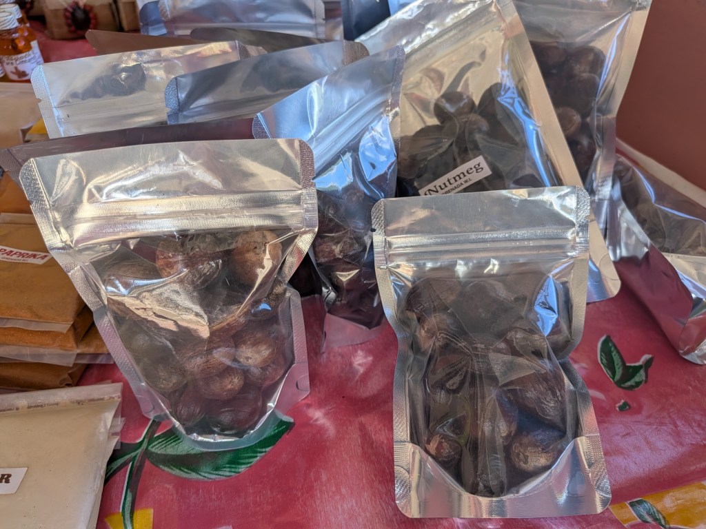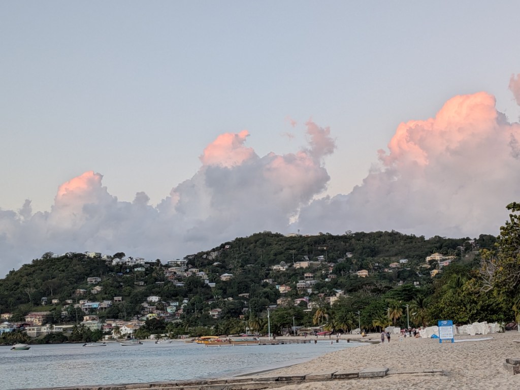 Our new home, complete with verandaGrand Anse beach – white sand, warm crystal clear waterThe beach is about a mile and a half long All beaches should have shady trees right near the shore – no umbrellas required!Our favorite street vendor made us some fresh Trinidadian doubles for lunch – curried chickpeas in a spicy pepper sauce wrapped in two flour tortillas.Yummy doubles!We checked out the local marketGrenada is known as the Spice Isle, so lots of spices are packed in little baggies for tourists – cinnamon, red pepper, turmeric, mace and gingerThe main export is nutmeg, here in its whole formLocal wildlife Pink clouds in the afternoonThe swimmers go home as the sun goes downWe could get used to this!