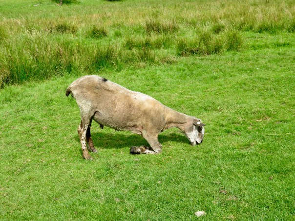 Okay, do you remember the scene from The Wizard of Oz when Almira Gulch is pedaling her bicycle furiously through the twister? Start there. Add the music if you wish. Then add driving wind that knocks you backward at every step. Gusts of rain like needles on your face. Now trudge uphill, directly into the wind! Don’t forget to climb over every stile, holding on for dear life! The big rocks that we clambered happily over yesterday are now slick and treacherous. The dry gullies are now filled with rushing water. The only blessing is that sheep turds are sufficiently heavy that they do not become airborne, because flying sheep dung in the face would just really be the last straw!