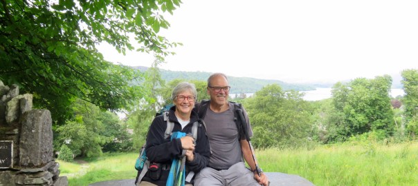 Jim’s pack cover went airborne, and he just managed to grab it. After four miles of this torture, we reached the cairn that our guidebook said was the highest elevation of the entire hike. Of course we stopped for a picture!