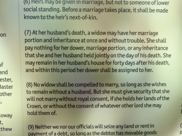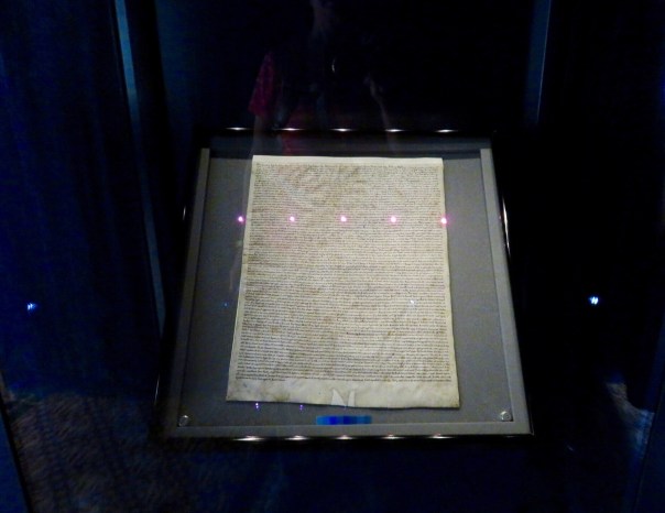 The actual parchment is kept in a darkened room, and you aren’t supposed to photograph it. You know I did anyway. The mark on the bottom is where the King’s wax seal was originally affixed.