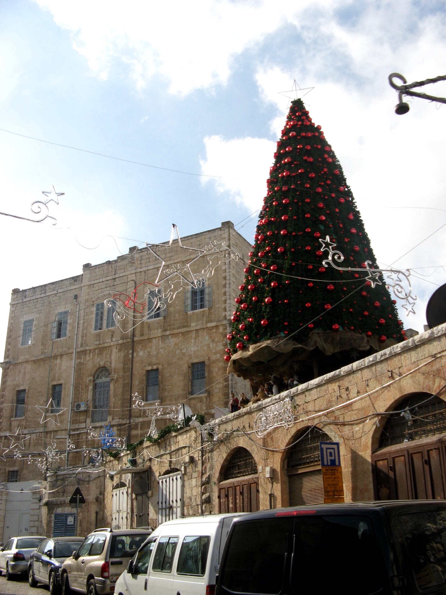 Two blocks away is the Franciscan version of the same church.image Remember how much Nazareth likes Christmas? So does Cana! In addition to the big tree, the streets are still lined with multi-colored Christmas lights. Very festive!