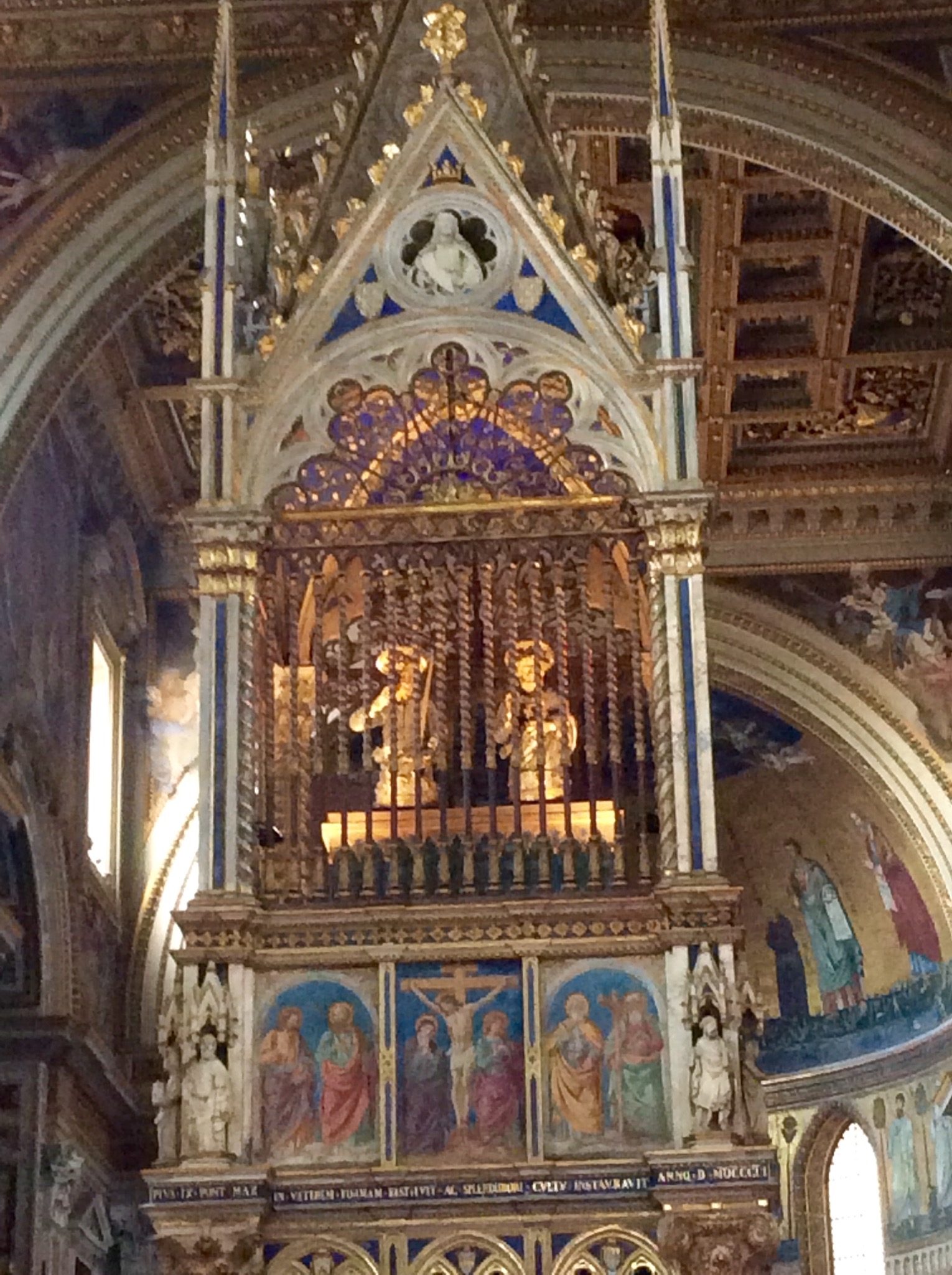 This cathedral is unlike others we have visited in that it is not lit in a modern fashion. The small windows, high up, don’t provide much illumination during the day. The candlelit interior must look very much as it did 1000 years ago. The low lighting helps explain why there was so much focus on filling cathedrals with gold – the reflective quality was needed to see!