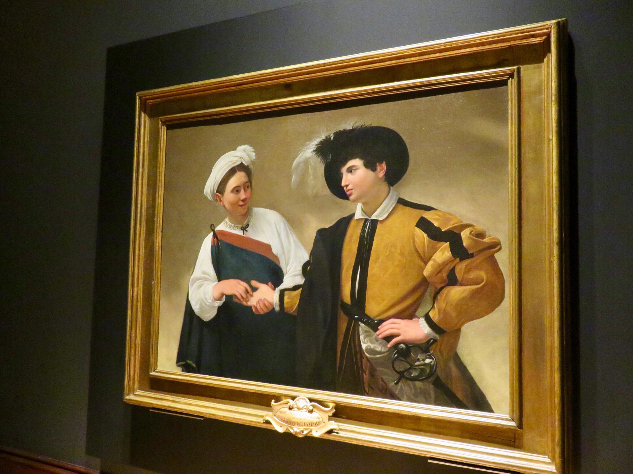 We walked through several rooms of paintings by others who were inspired by Caravaggio, and then finally to the room where his painting, The Fortune Teller, was displayed. Dozens of art students huddled around it, taking notes. It was the only Caravaggio on site, and was one of his earliest works, showing a pretty young fortune teller smiling beguilingly at a handsome young man while she takes his palm and steals his ring.