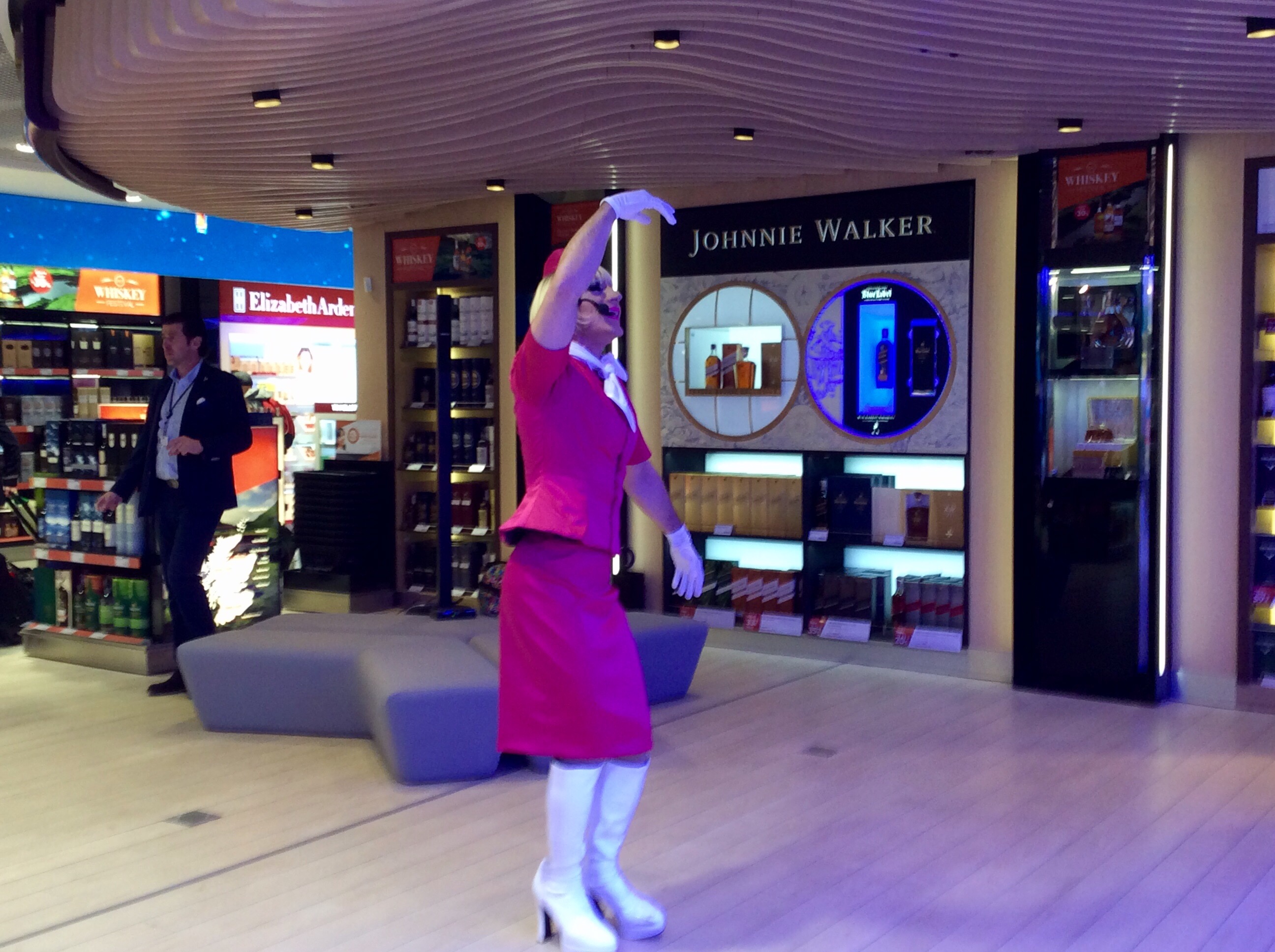 We were amazed and amused to encounter a singing trans stewardess belting out “I’ve Gotta Be Me” in a husky baritone in the duty-free shop. We slugged the free Jagermeister shot offered, and applauded enthusiastically.
