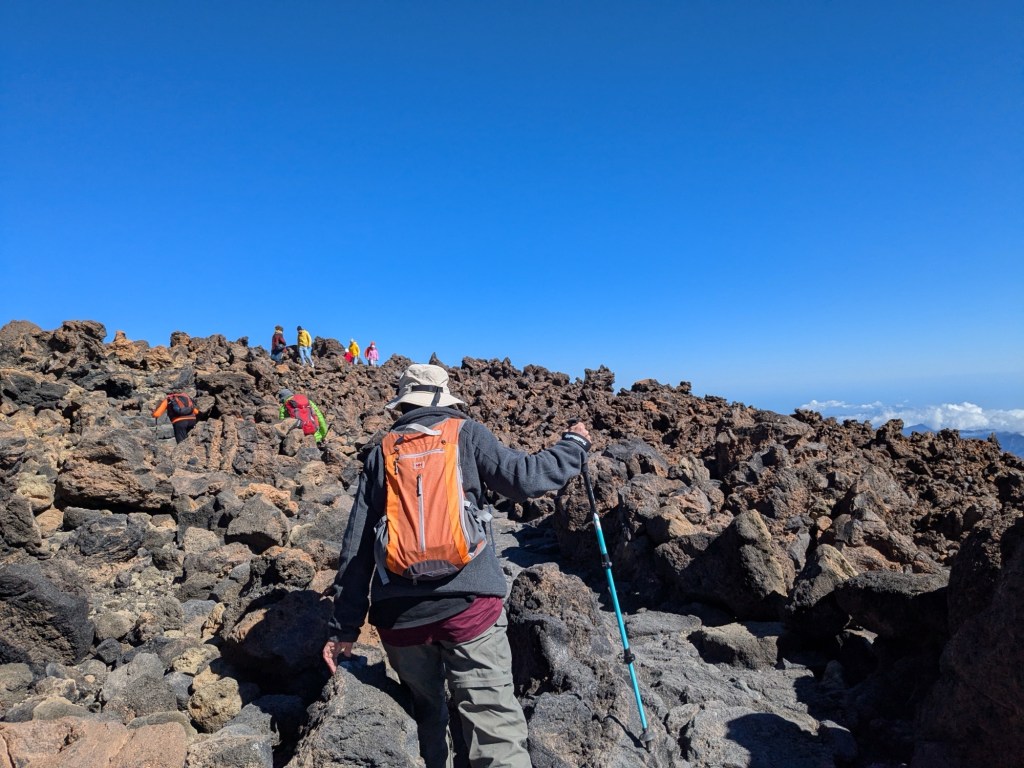 Here in Vilaflor we are at an altitude of 3400 feet, but El Teide is 12,100 feet. Here it is chilly, but up there it will be cold! We dressed appropriately, meaning I put on a tee shirt, a long sleeved shirt, a sweatshirt, a fleece jacket, a scarf, a floppy hat, and two pairs of pants. That’s all the clothes I’ve got, so it will have to do!