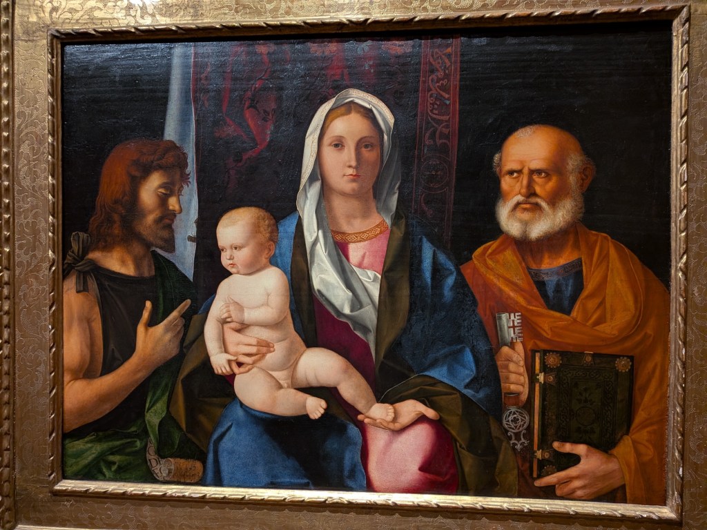 This is an odd one – Madonna and the infant Jesus flanked by John the Baptist (who you may recall is only a few months older than Jesus) and St. Peter (who did not meet Jesus until about 30 years later).