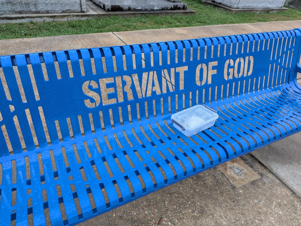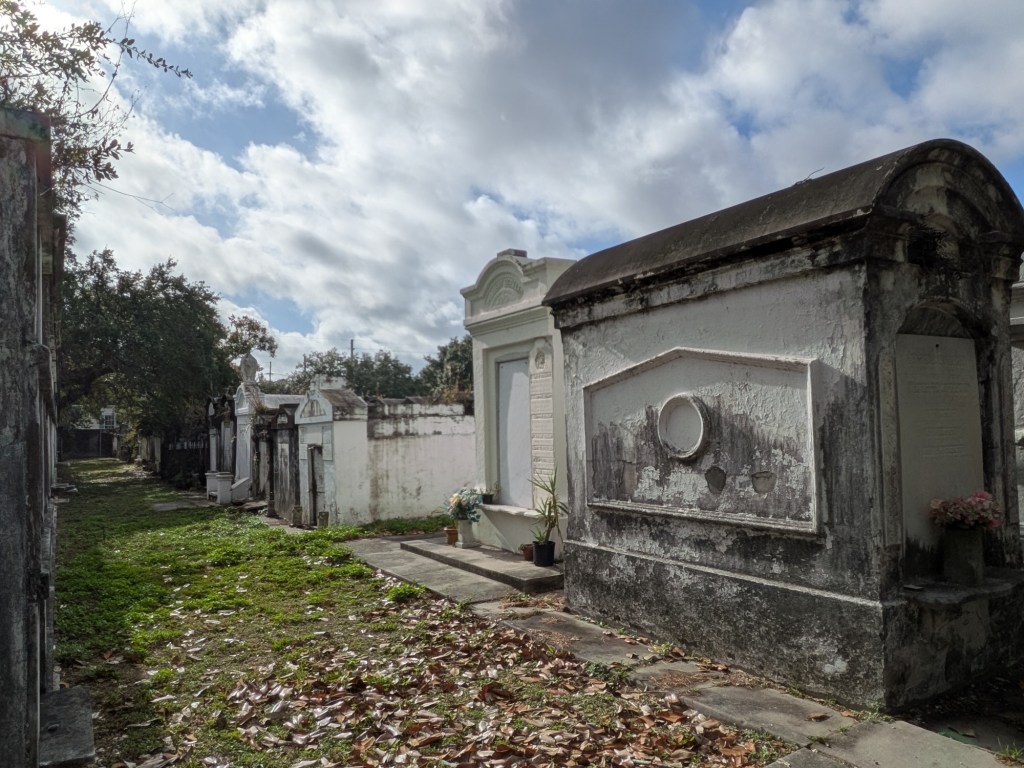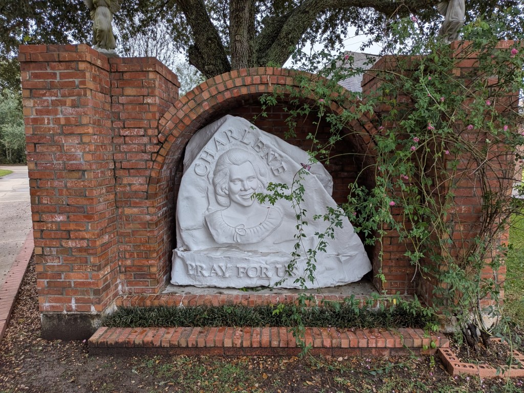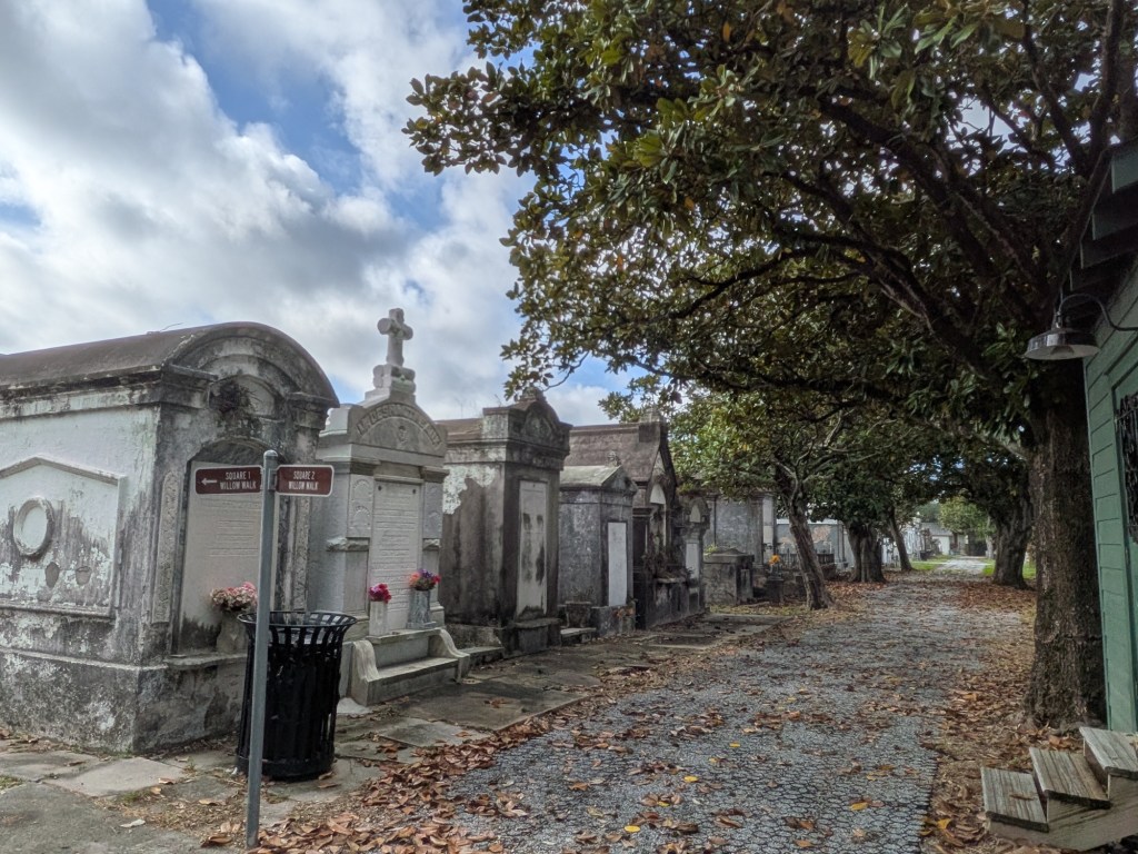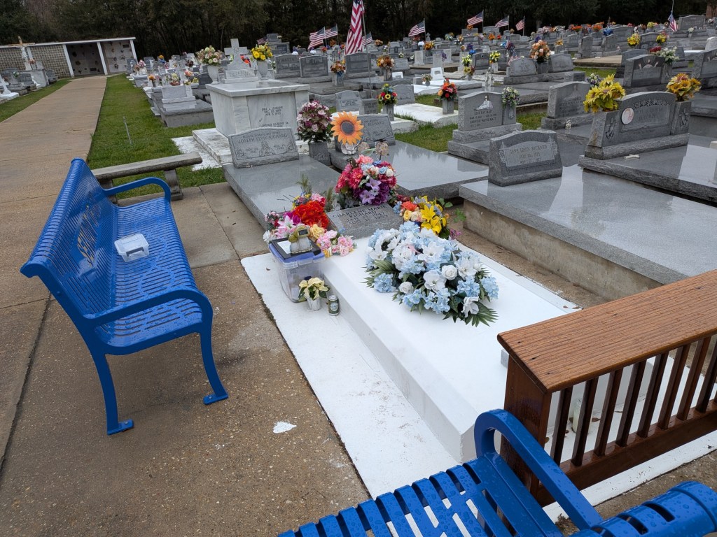 Nov 30 – A rainy gray morning, somehow befitting that we are visiting a cemetery today to see the Little Cajun Saint. Jim is interested in stories of miracles.