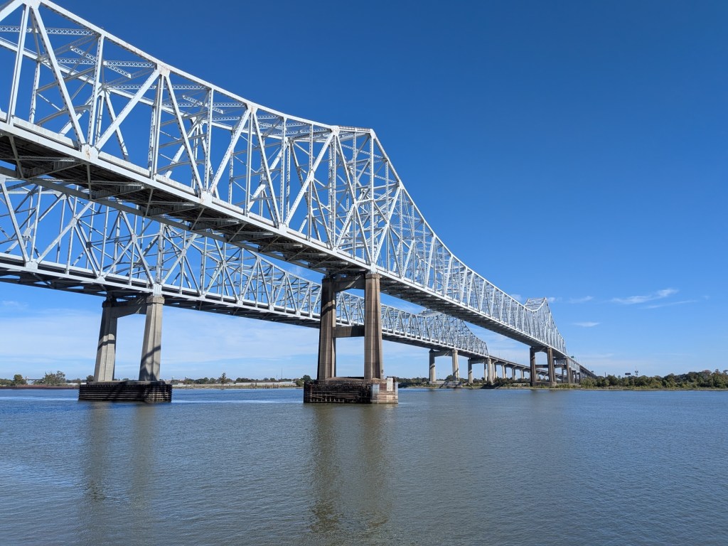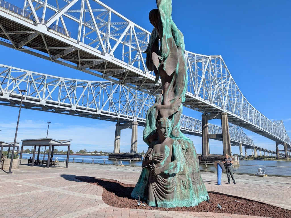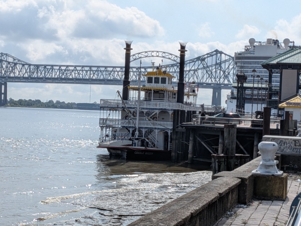 Nov 22 – Although we’ve been in New Orleans for almost a week, we have yet to see the Mississippi River. It’s only a block from the heart of town on Canal Street, so we sauntered over to have a look.
