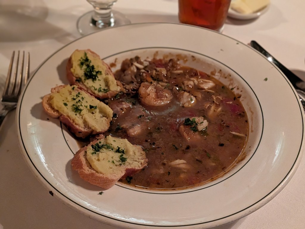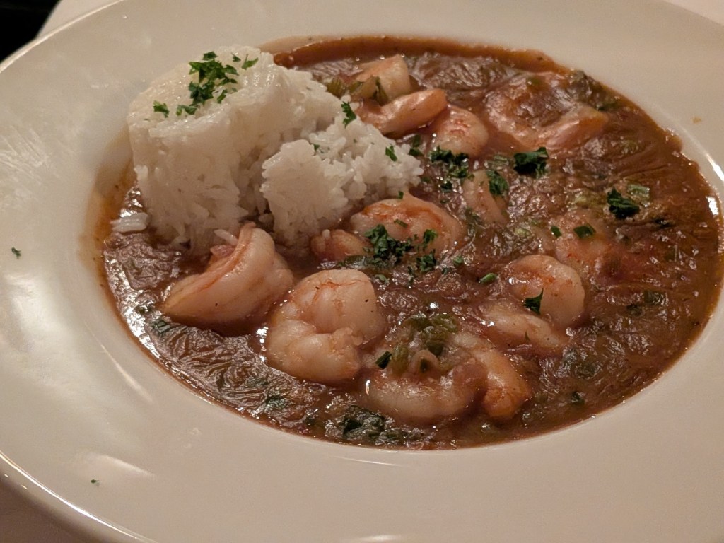 To celebrate, we went out to dinner with Jim’s colleagues, to the fancy French restaurant Galatoires. We started with turtle soup, which was a first for me. Very good! I had the shrimp étouffée in brown roux, and it was delicious.