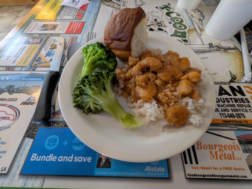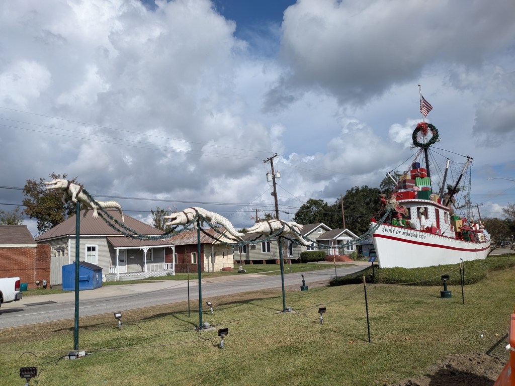 We stopped for lunch in Jeanerette, but arrived too late for the Cajun special. The fried shrimp were tasty, but we’ve really had enough fried food.