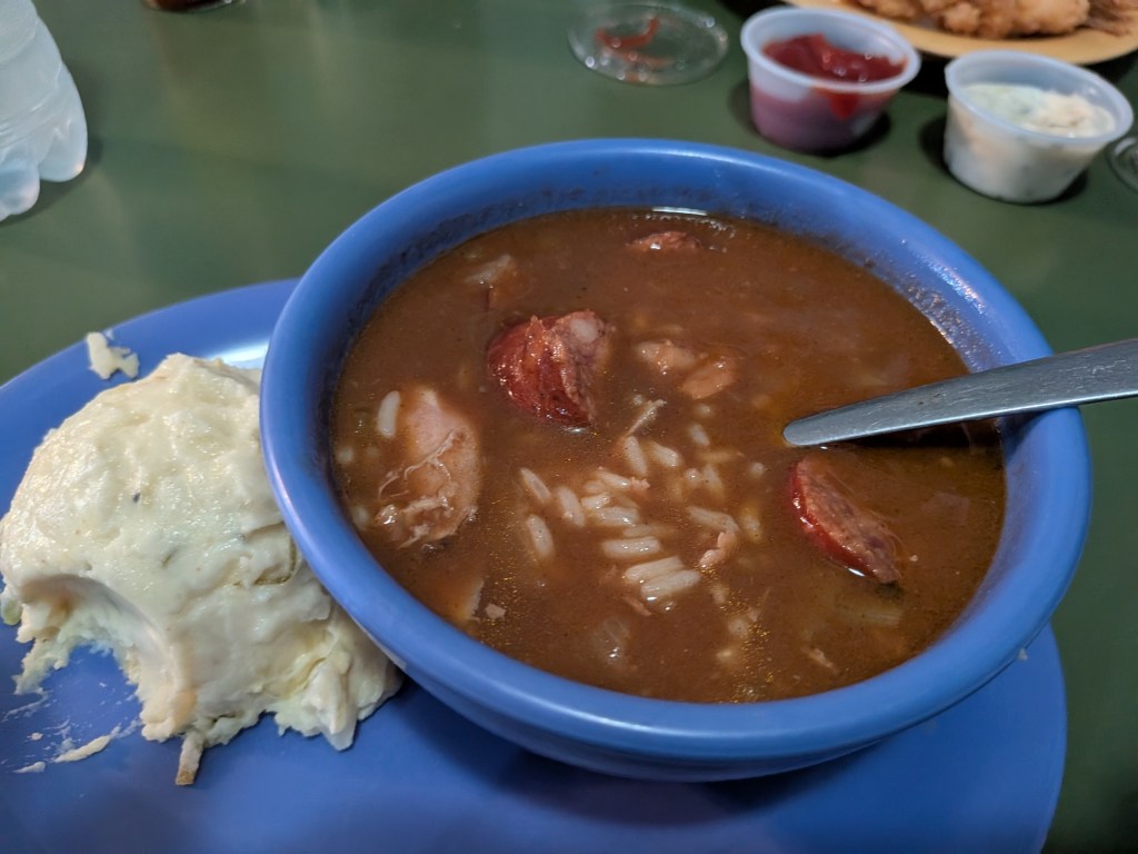 The Cajun gumbo (shrimp, sausage, chicken and rice) was mighty fine. The potato salad was mashed and really creamy. Quite the day!