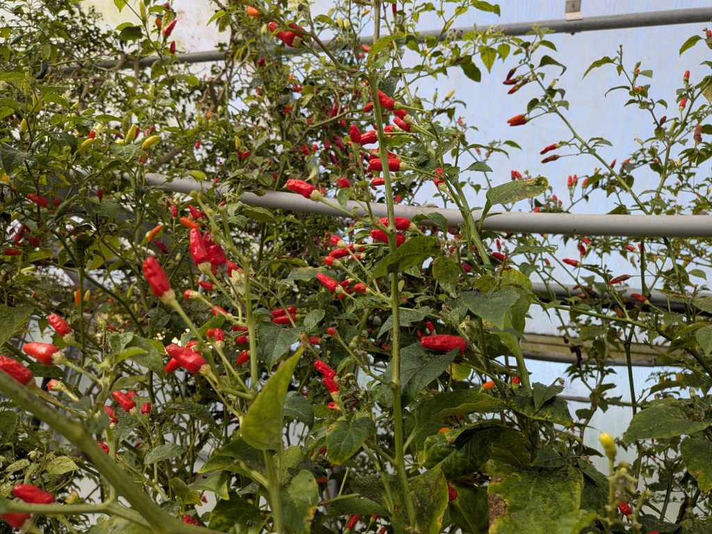 We walked through the greenhouses where the peppers are grown. Tabasco peppers face upward, toward the sun.