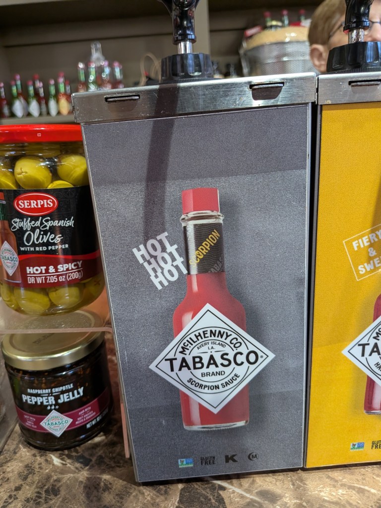There are 12 different Tabasco sauces offered, from mild to super hot. I particularly liked the garlic sauce.