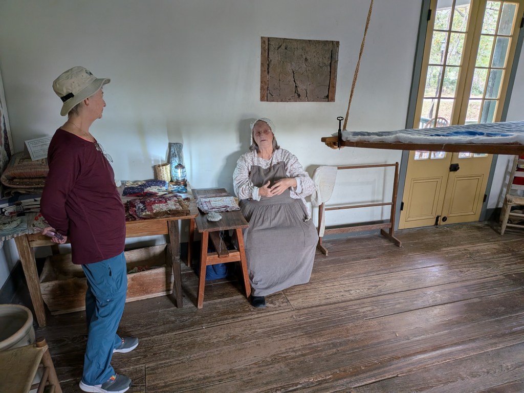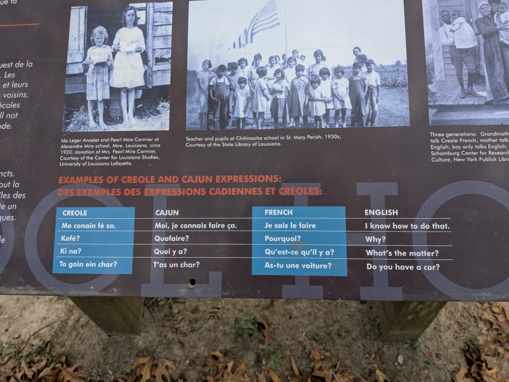 Nov 29 – Today’s adventure was a visit to Vermilionville Historic Village to learn about early Cajun culture. Vermilionville was the named of this area before it became Lafayette. The word Cajun is a corruption of the word Acadian, the French people who were forced to flee here from Nova Scotia in the mid 1700s to get away from the British. All the signage here is in French first, then English.