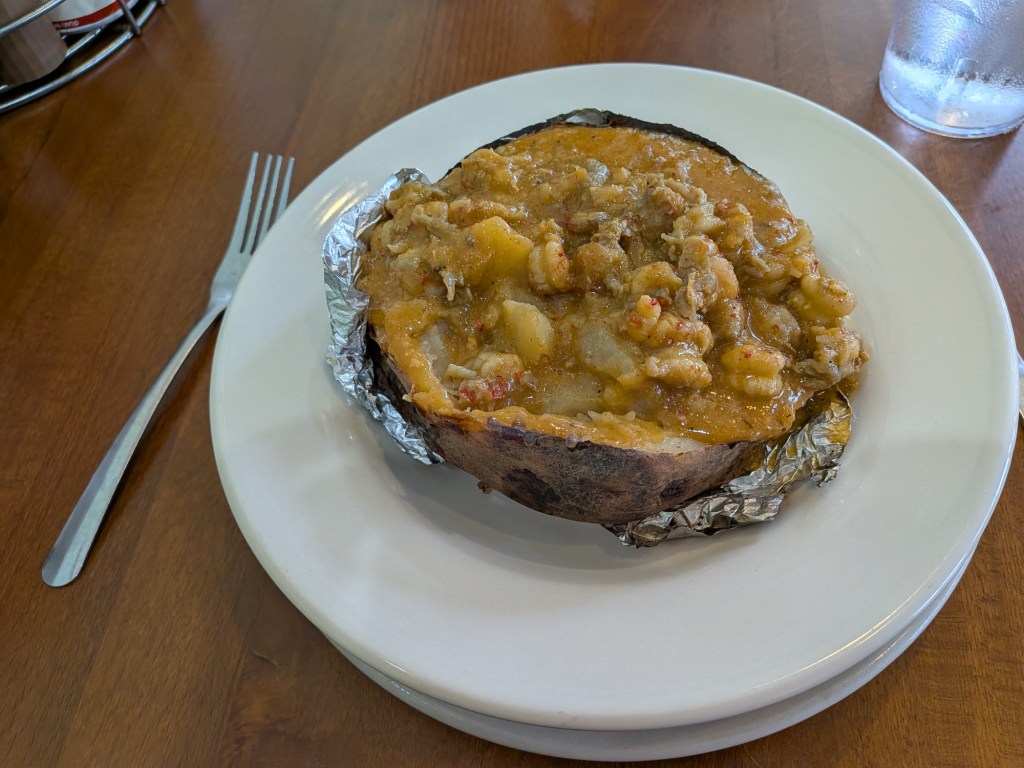 …and a baked potato filled with an excellent crawfish étouffée