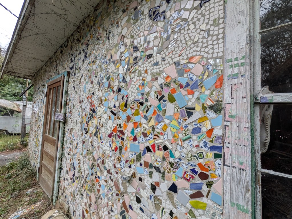 A building covered with a mosaic of broken pottery