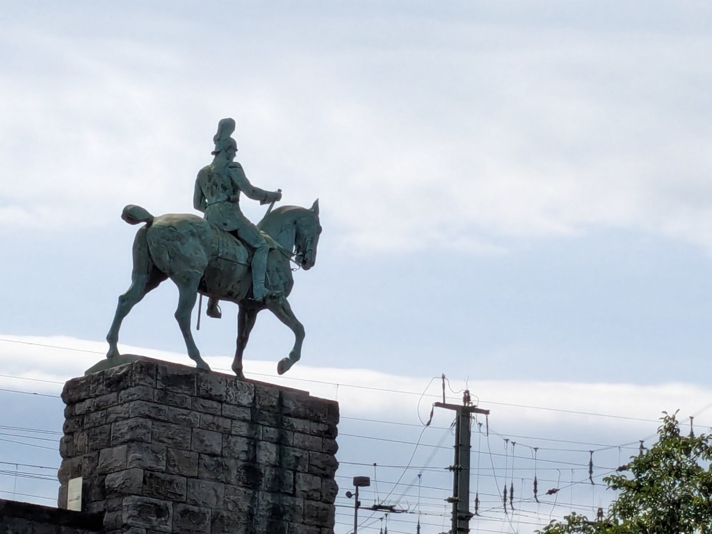 July 13 – Back on the train for the two hour ride south to Koblenz. This is a much smaller city, that sits at the Deutches Eck, where the Moselle River meets the Rhine.