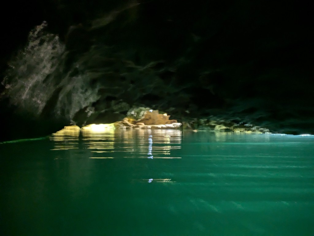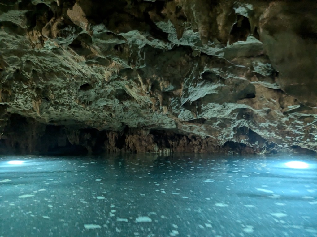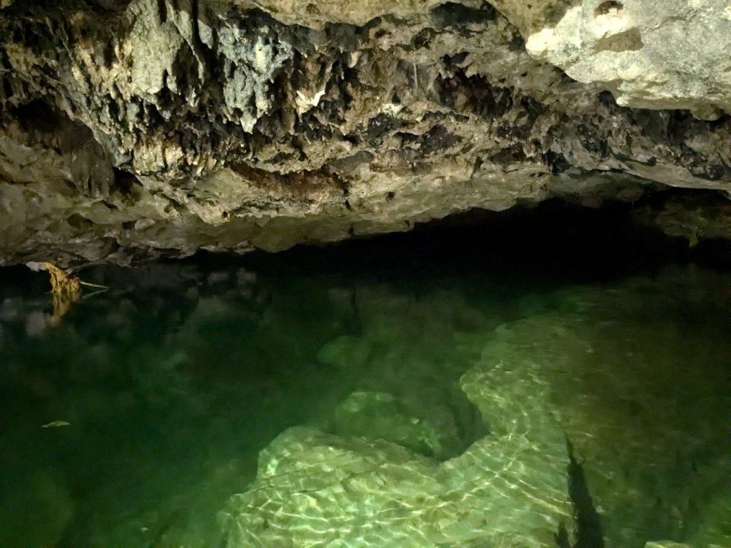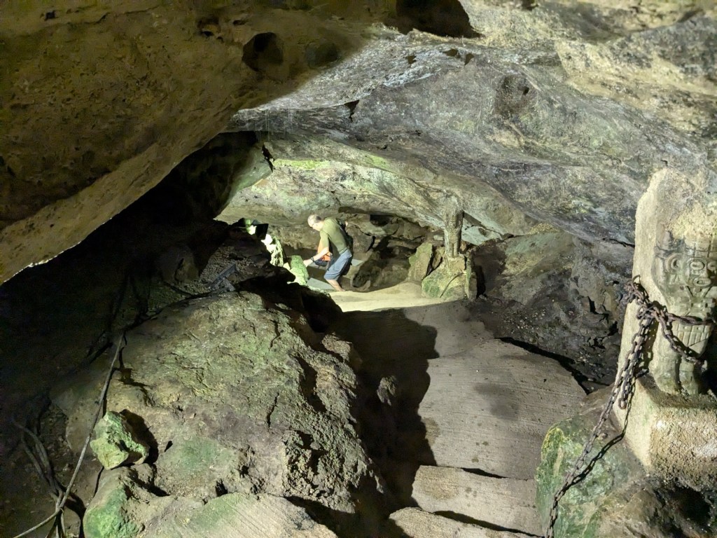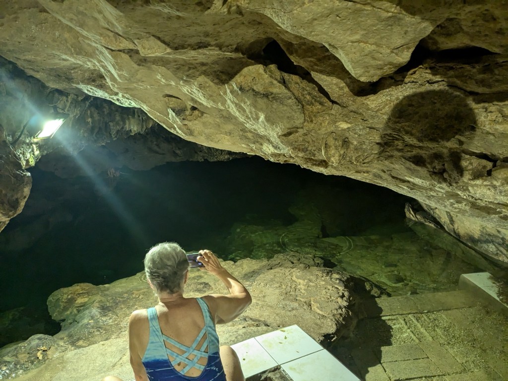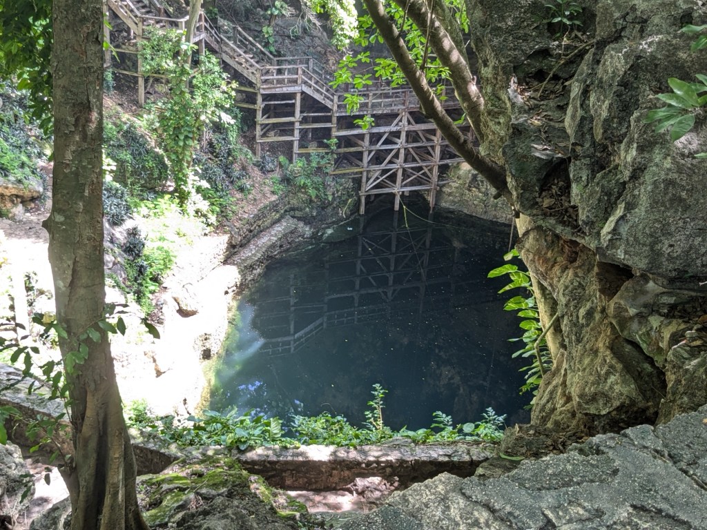 Cenote Chihuan, in the town of Holcá, is on private land and is said to be the only totally subterranean cenote. Our taxi pulled up to the gate and it was… closed. Not again! The taxi driver banged on the gate and shouted, but no bananas. Our driver got back in the cab and started searching on his phone for an alternate cenote, when the proprietor opened the gate. Success!