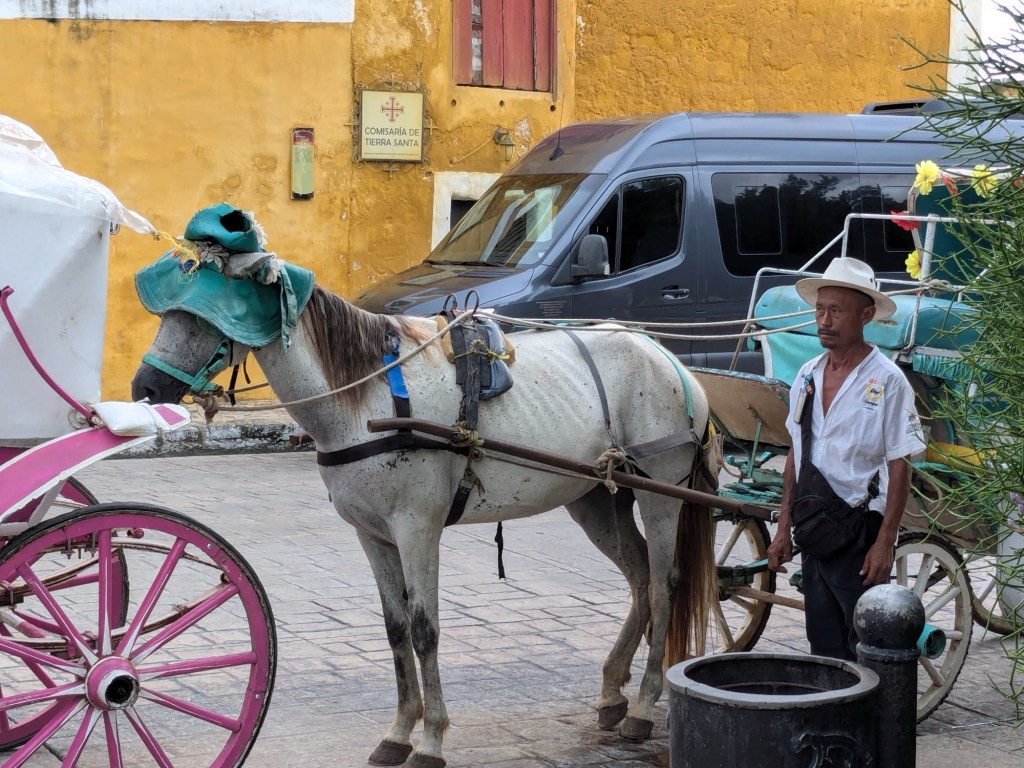 Aug 30 – One more yummy omelette at our Celestún hotel, and we were off to the bus station for our ride to Izamal. Little did we know that our big bus was a local, not an express. We boarded the bus at 9:30, changed buses in Mérida at 12:30, and arrived in Izamal at 3pm. And there weren’t any movies to watch on the bus!