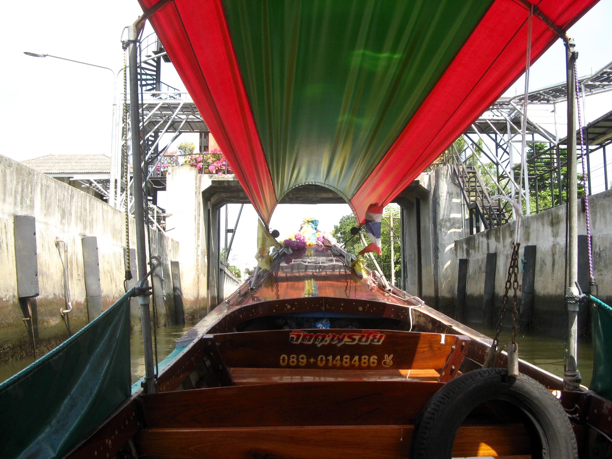 As we walked toward the Amulet Market early in the morning (trying to beat the heat, but it was already 85 and climbing) a distinguished looking and well-spoken gentlemen stepped up to advise us that today was a holiday and the markets were closed. Another man in a security uniform confirmed this.  The nice gentleman, who said he was a college professor, went on to tell us that if we needed something to do instead, he would suggest a wonderful boat ride through the canals of Bangkok that could be had for a special price during the holiday (the King’s birthday!) He warned us not to use a tuk-tuk with red or blue numbers, which would overcharge us, but only ones with a white and yellow sign. As he said this, a tuk-tuk with a white and yellow sign pulled up to the curb, and the gentleman told the driver to take us to the dock for 20 baht (60 cents). As you are reading this, you must smell a fish, but he was so smooth and it happened so quickly, we just went along. He wanted no money, didn’t seem to be selling anything, and who could argue with the price of the taxi?