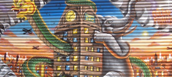 5/8 – We are only in Bangkok for a few days, and can’t hope to see all that the city has to offer. Jim has been here many times during his army years, and his years teaching in Asia.  This is what I would call a gritty city – full of smells and packed with people. The image above was spray painted on a roll-up aluminum door. image