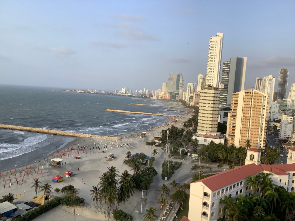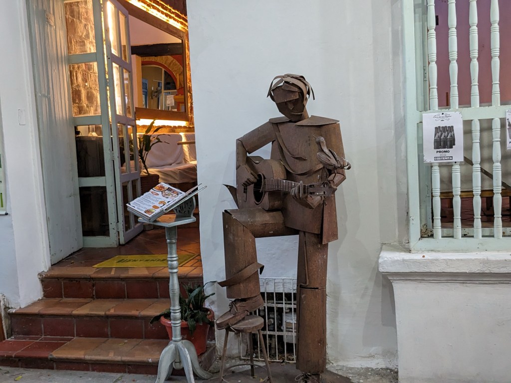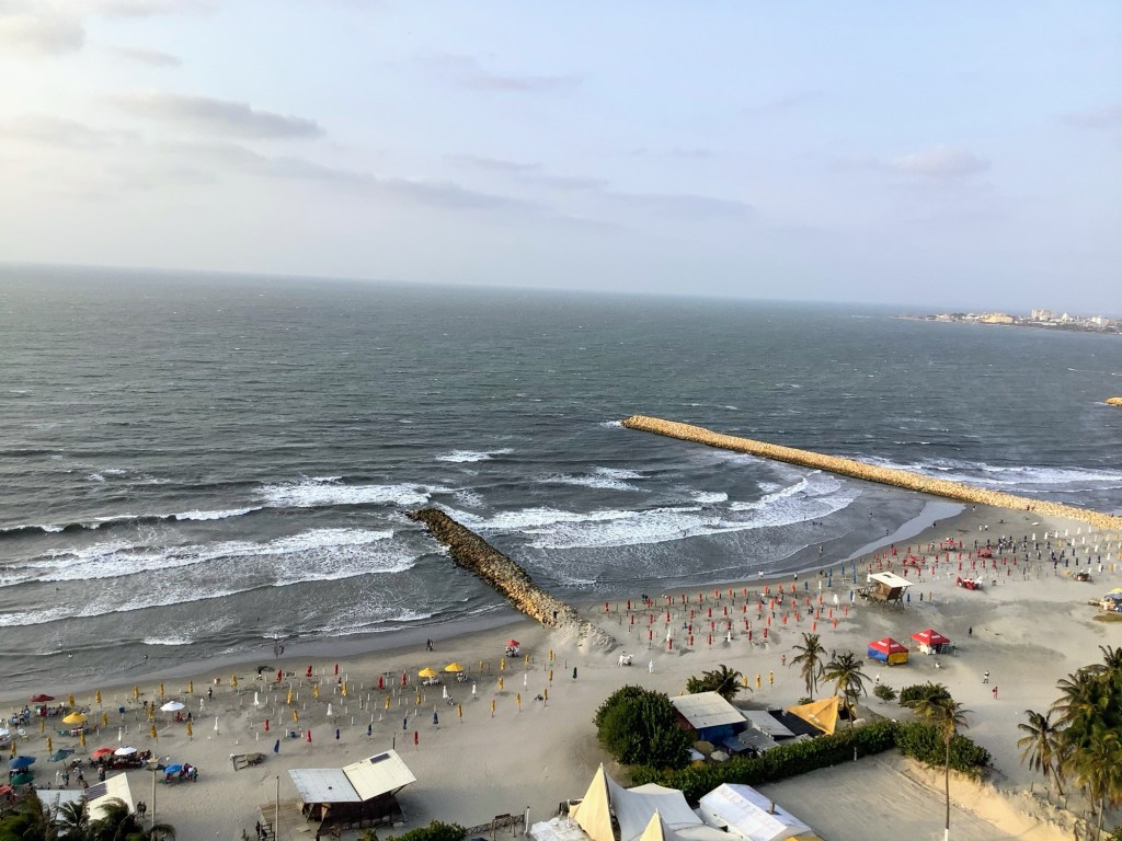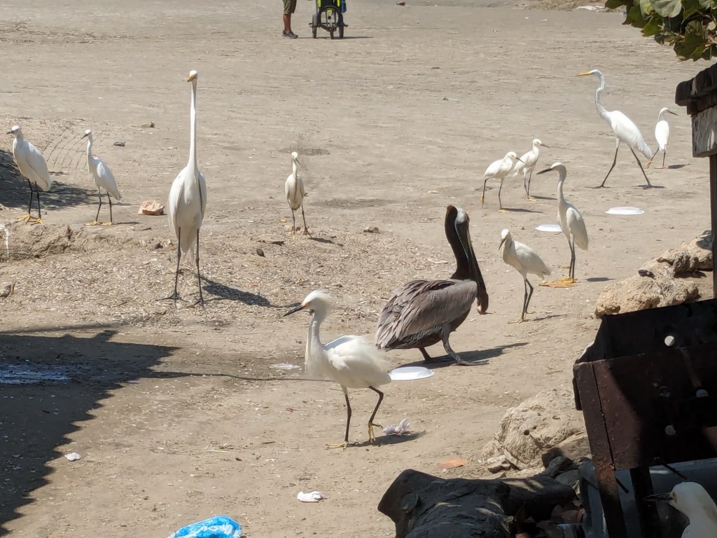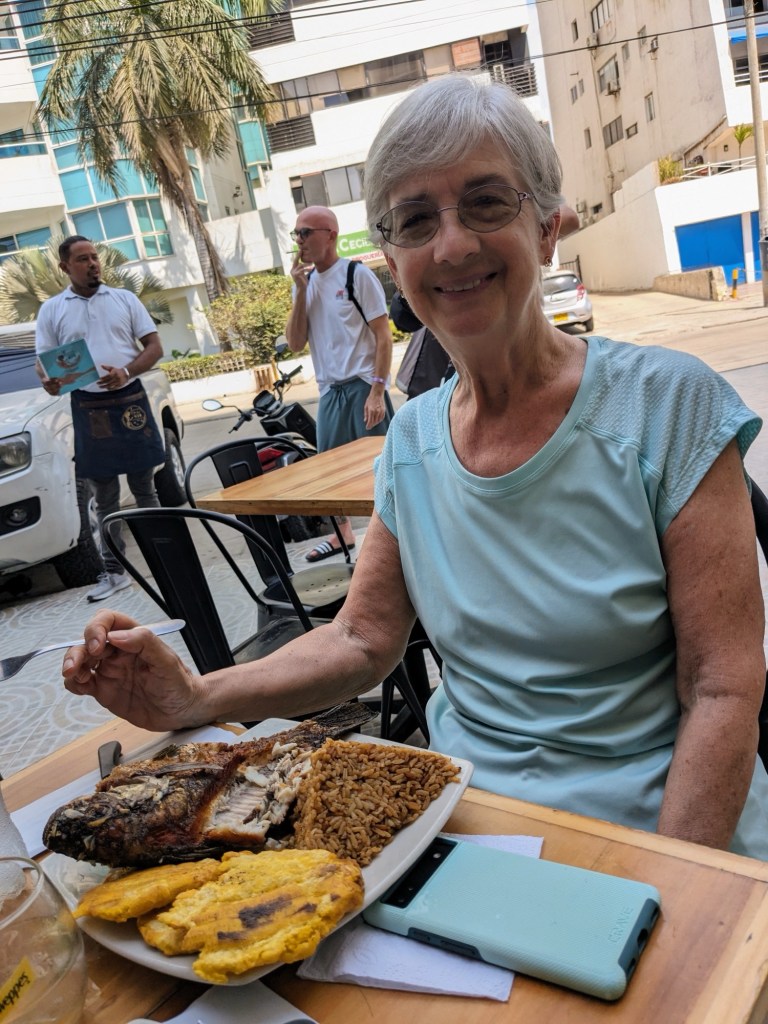 Go to the beach every morning. We walk along the shore, getting accosted every five feet by touts wanting to rent us a chair or umbrella or sell us sunglasses. Jim is a strong swimmer and wanted to swim in the surf, but before he got past his waist, the lifeguard told him, “No mas!”
