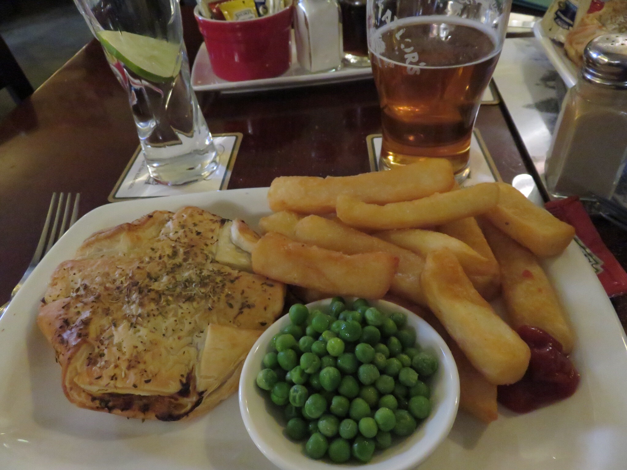 We crossed the street to the pub and ordered a Mediterranean Vegetable Wellington. Turns out, a Wellington is anything baked in a puff pastry. Very tasty, although the chips and peas are becoming standard fare.
