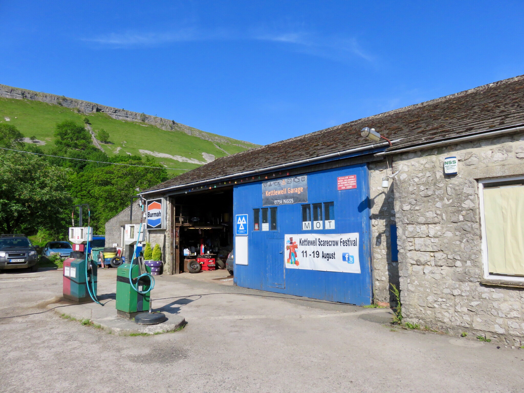 Now, here is something you may not know. Kettlewell was the town used as the set to make the film Calendar Girls, in which a group of old English matrons decide to pose nude in a calendar to raise money. Here is the Kettlewell Garage, where the matrons got the idea after seeing a girlie calendar on the wall.