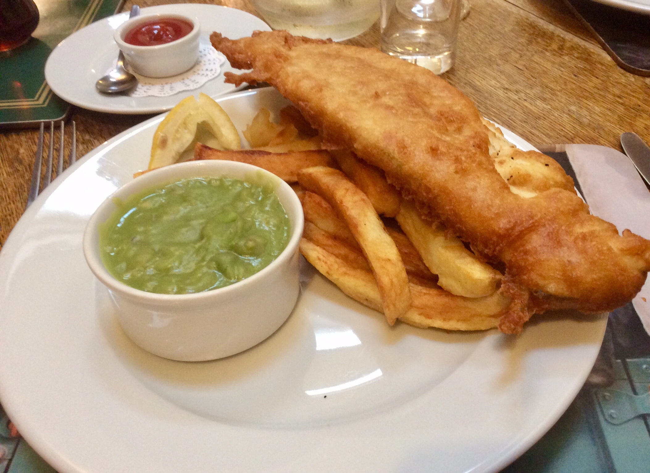 I opted for the even more traditional haddock and chips, accompanied by a serving of mushy peas. After liberally applying salt, pepper, catsup and brown sauce, we pronounced all the food delicious. Everything you’ve heard about the blandness of English cuisine is, as far as we can tell so far, true.